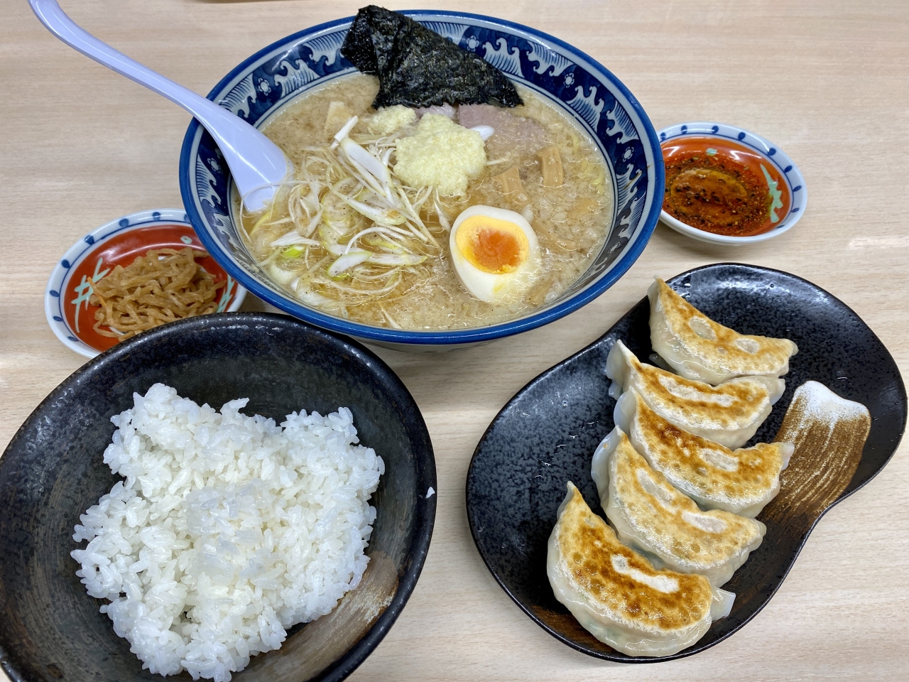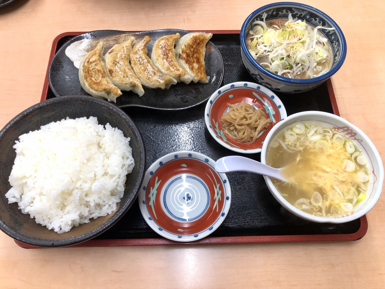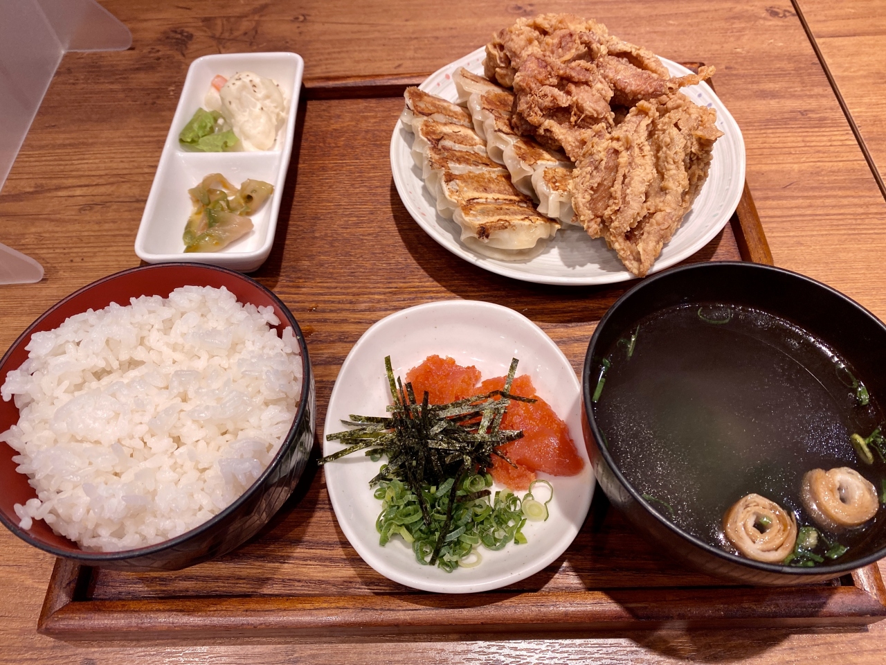 焼餃子(10個)・唐揚げ(3個)・明太子・ポテトサラダ小鉢・ライス・スープ という美味しいものだけで構成された最強ランチですね。♪( ´▽`)