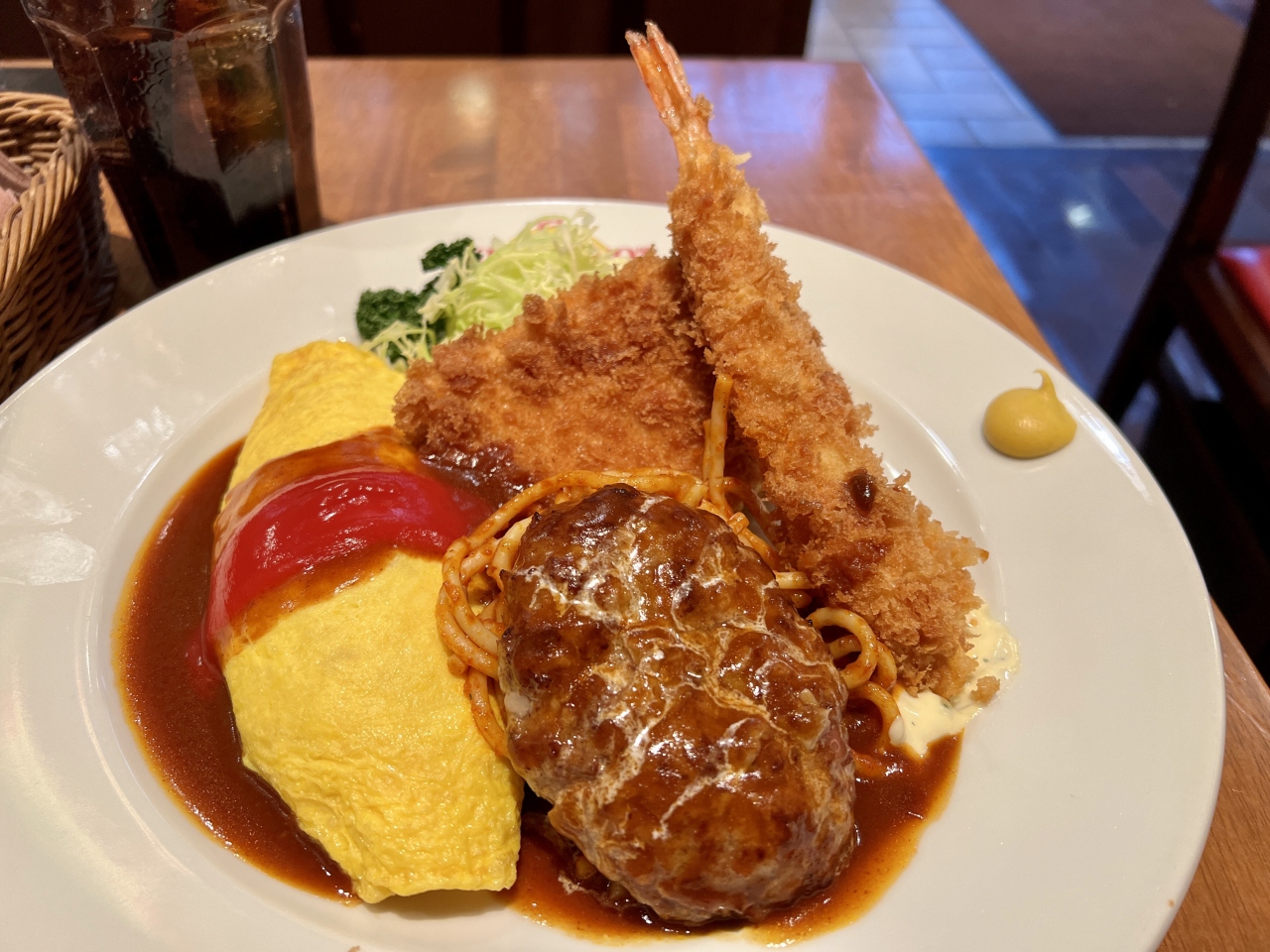 メニューを見るとオムライス、ナポリタン、ハンバーグ、海老フライ、チキンカツ、ポテサラの盛り合わせの『大人のお子様ランチ』1,680円が目に止まりこれにサラダドリンクセット350円を注文しました。