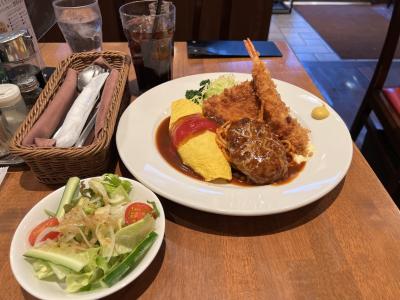 海老フライ、チキンカツも大きくてサクサク、ハンバーグはジューシィで美味しい。