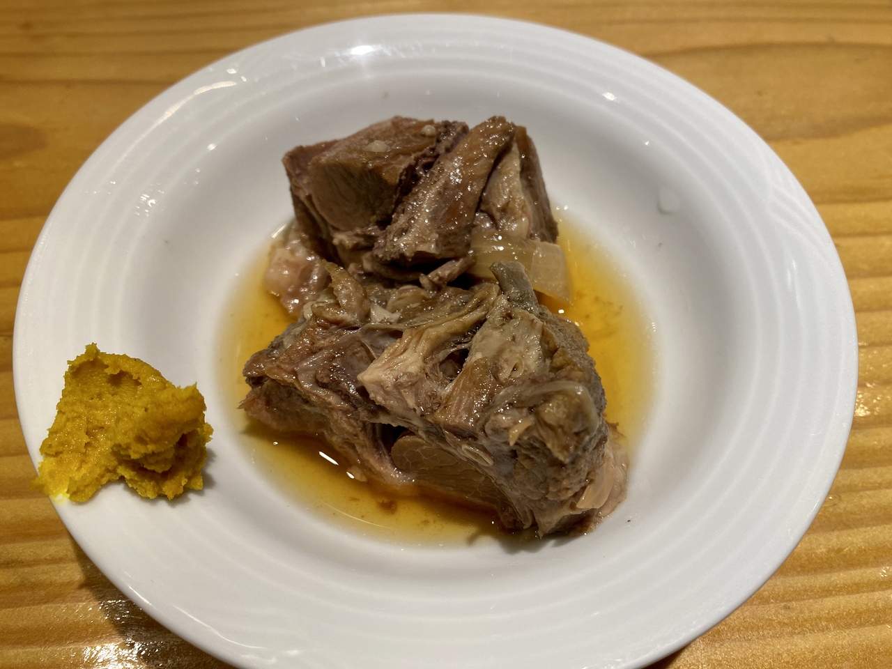 夜の時間は、牛タン角煮550円がお通しで付いてきます。箸を刺すとホロホロに崩れて美味しいですね。トマトスライスは大きな湯むきしたトマトが非常に薄くスライスされています。