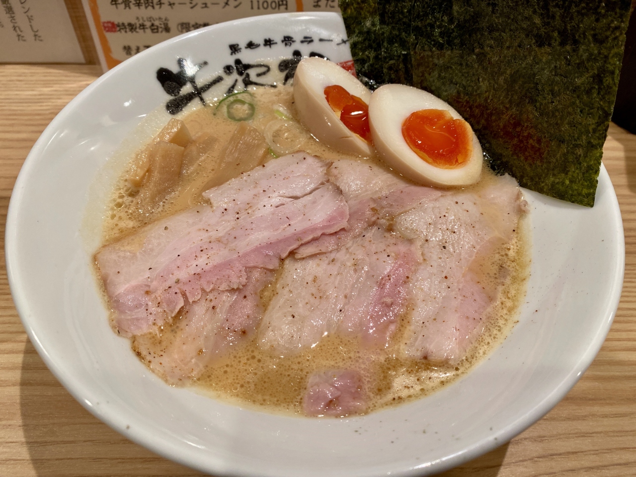 普通はとんこつから鶏ガラスープのラーメンが多いですが、こちらは珍しく牛骨のスープです。