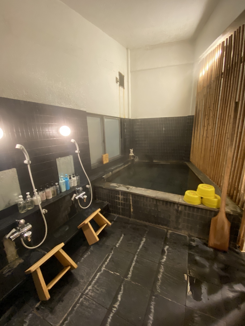 今回は、料理がおいしいと人気の『旅籠 いとうや』さんに宿泊しました。こちらの旅館は部屋が4部屋のみとなっています。温泉は入る時に『入ってます』の札をかけるので必ず貸切風呂になります。温泉の色は透明ですが硫黄泉のいい香りがします。源泉掛け流しでお湯はちょっと熱めですが冬は冷えた体があったまります。