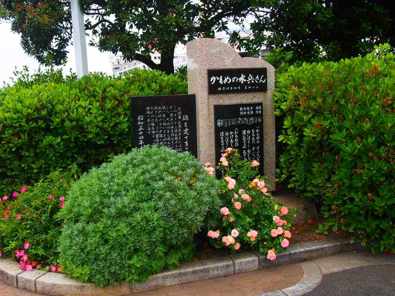 かもめの水兵さんの碑は、氷川丸を背にバラ園を向いて設置されています。なぜ海に向けて建てられなかったのかが大いに疑問。背中は海、前はバラ園ということで人々の視線がこのかもめの水兵さんの碑に向かうことは少なく、存在を知らない人も少なくありません。