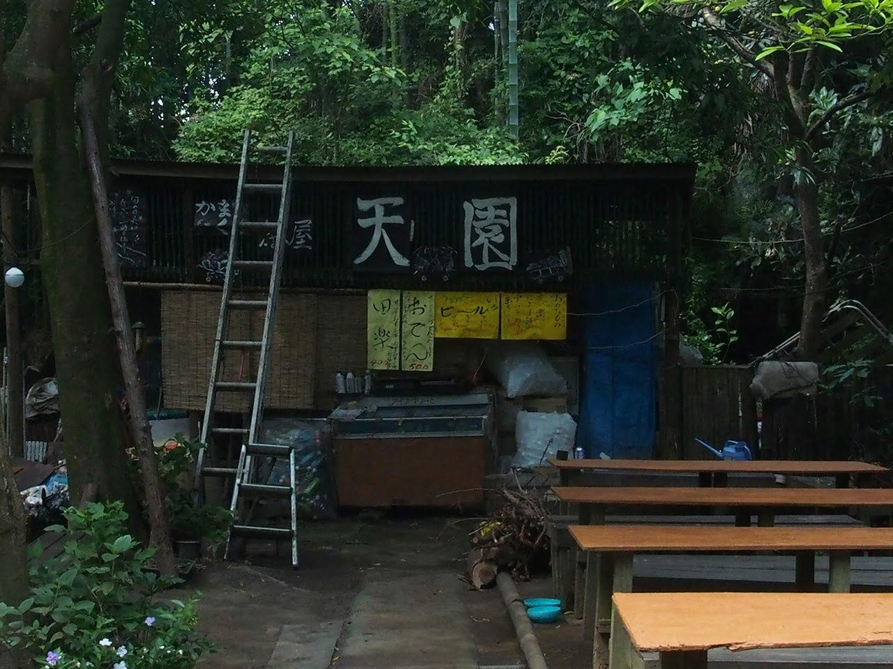 天園休憩所は天園ハイキングコースにある茶屋。普段ならばおでんやビールなどが頂けますが2020年6月現在、天園ハイキングコースは通行止めでありそれに伴い、天園休憩所も閉鎖されているものと思われました。ロープが張られ店内?には入れませんが自動販売機は利用可能でした。