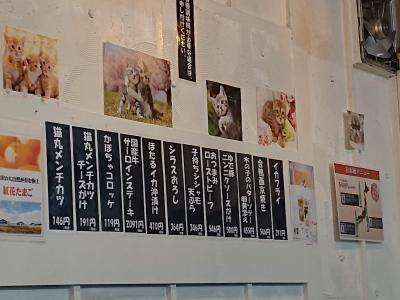 ネットでやけに評判が良かった東急東横線の菊名駅にある食堂。壁にはね気の写真、メニューにも猫の絵。