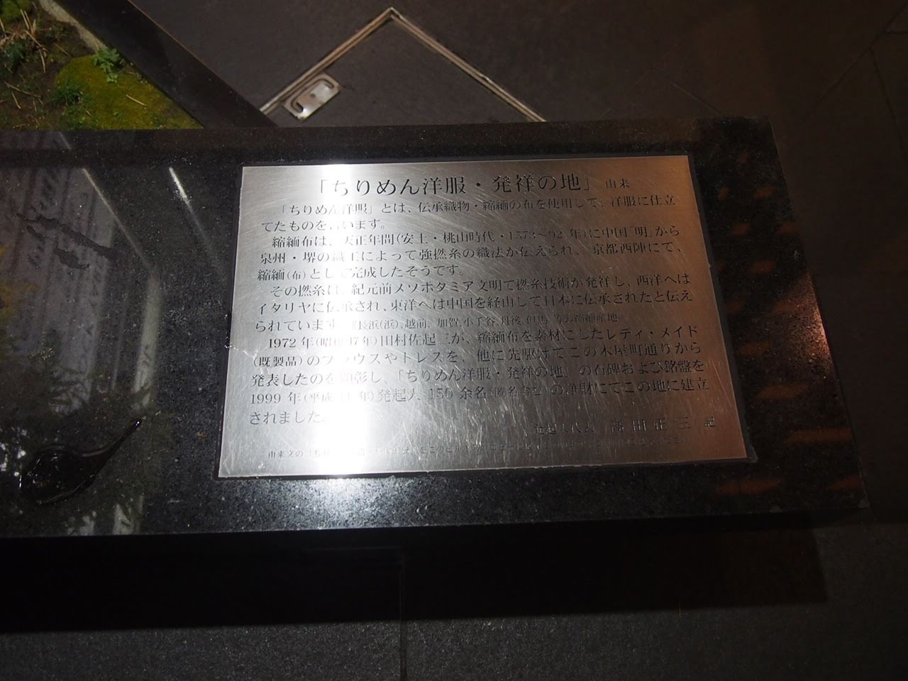 木屋町通りをぶらぶらと北上していた時に偶然見つけました。昭和47年に 田中佐起三という人がこの地で株式会社さきぞうを創業しちりめん素材を使った洋服を世に送り出したらしい。