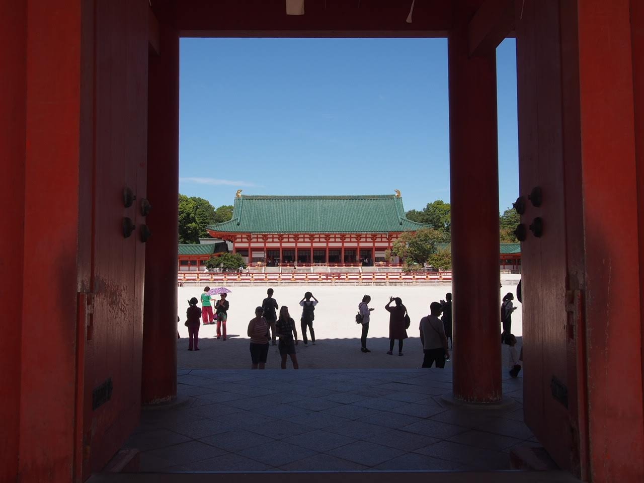 平安神宮 大極殿 は平安宮朝堂院の大極殿を復元したもの。応天門をくぐると目に飛び込んできます。左右にに蒼龍殿、白虎楼が配置されています。
