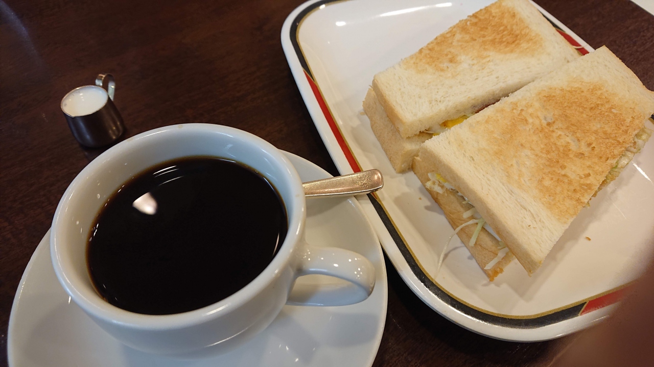 名古屋駅地下街メイチカの端の方にあるエビフライサンドを始めサンドイッチが有名な喫茶店でモーニングセットを頂いていてみた。コーヒーに130円プラスするとサンドイッチが付く。作り置きではなくその都度作る点が凄い。ただ、喫煙率が非常に高く分煙もされていないので嫌煙家にはつらい場所。