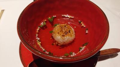 仏亜心料理とは、フレンチにアジア各国や和の要素を取り入れた料理を指すようです。確かにコースの途中に焼きおにぎりのだし茶漬けが提供されたり、最初からお箸がセットされていたりと和のテイストを感じるコース設定となっていました。