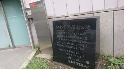 浜離宮の手前、郵便局の前に碑ががあったので近寄ってみると検査業務開始の地と彫られた黒い碑が。