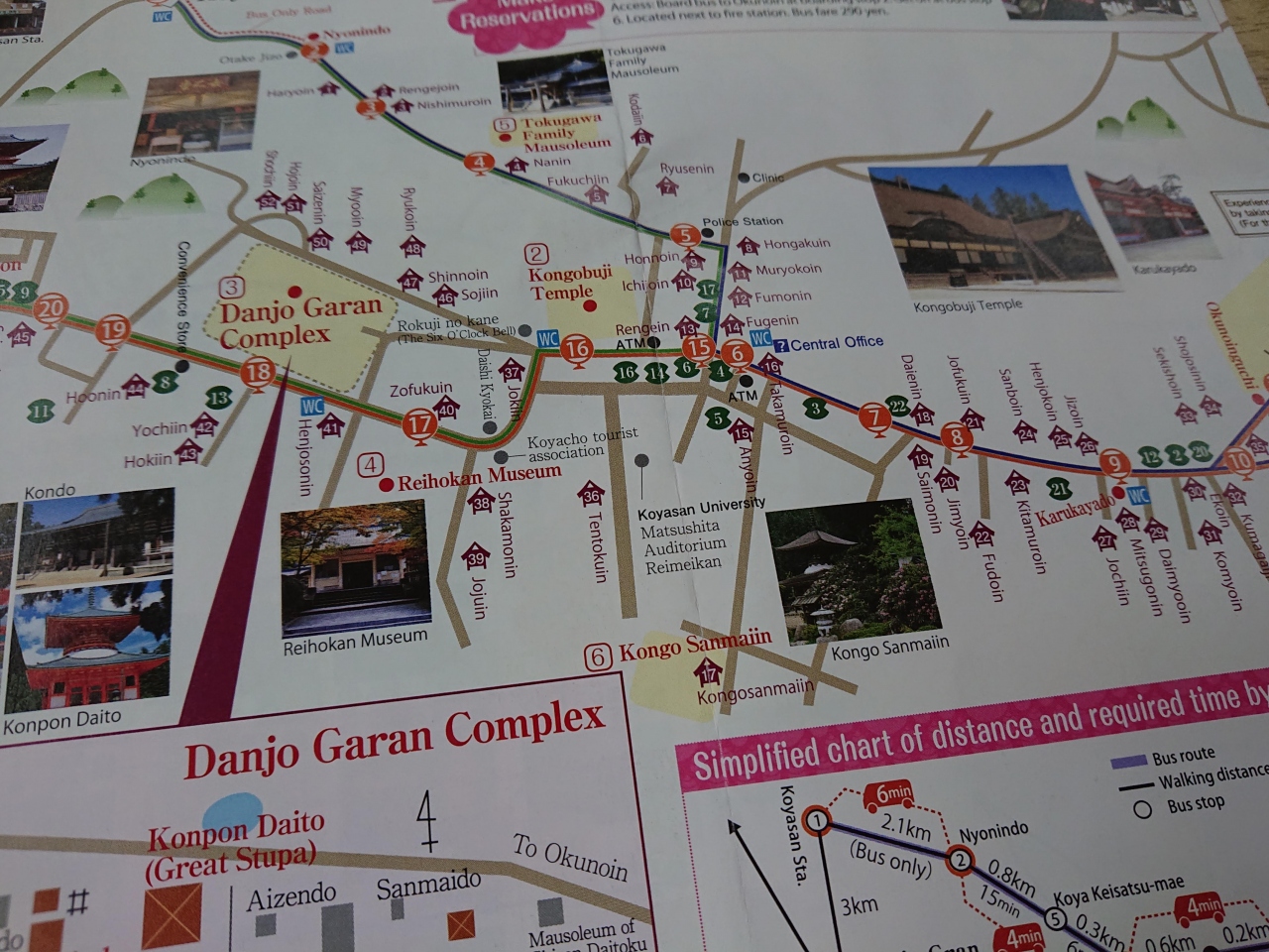 探せば見つかったのかもしれませんが、高野山には観光案内所的なものが見当たらず。その代わりというわけではないでしょうが、ケーブルを降りてバスに乗り込む前にバス会社の方々がバス路線地図をバス乗り場で配布していました。