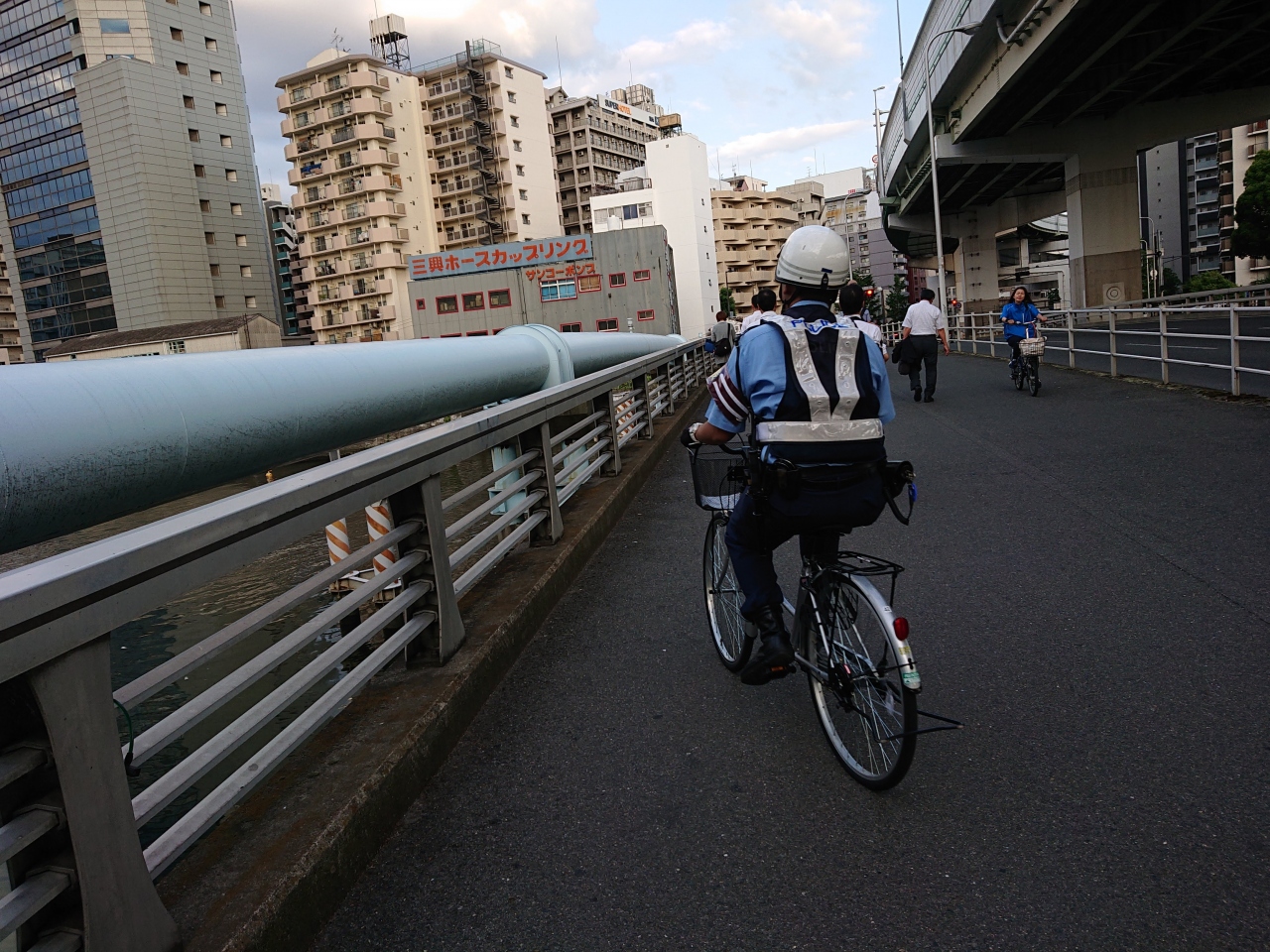 土佐堀川に架かる橋。阪神高速が橋の上を通っておりやや圧迫感がありますね。