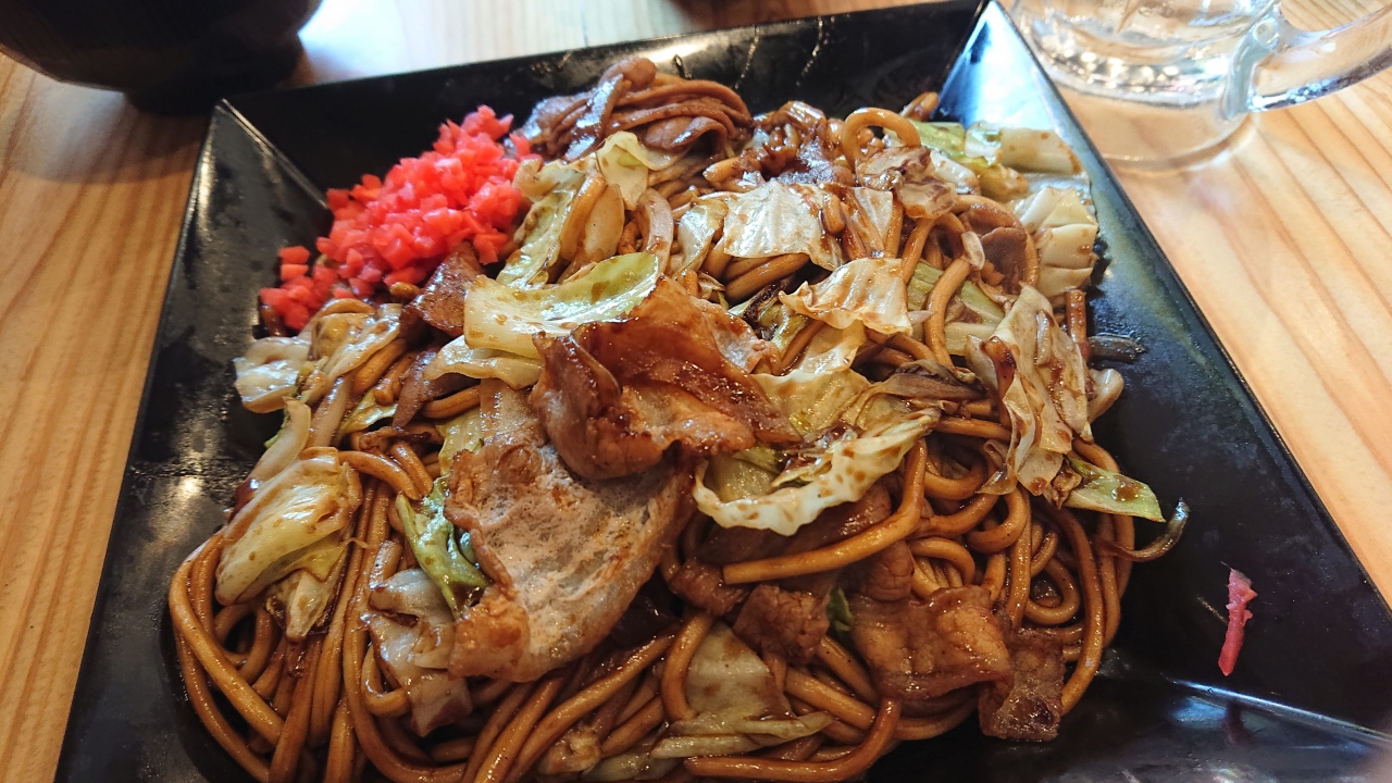 焼きそば定食を頼むと、焼きそばもごはんも大盛にできるという。