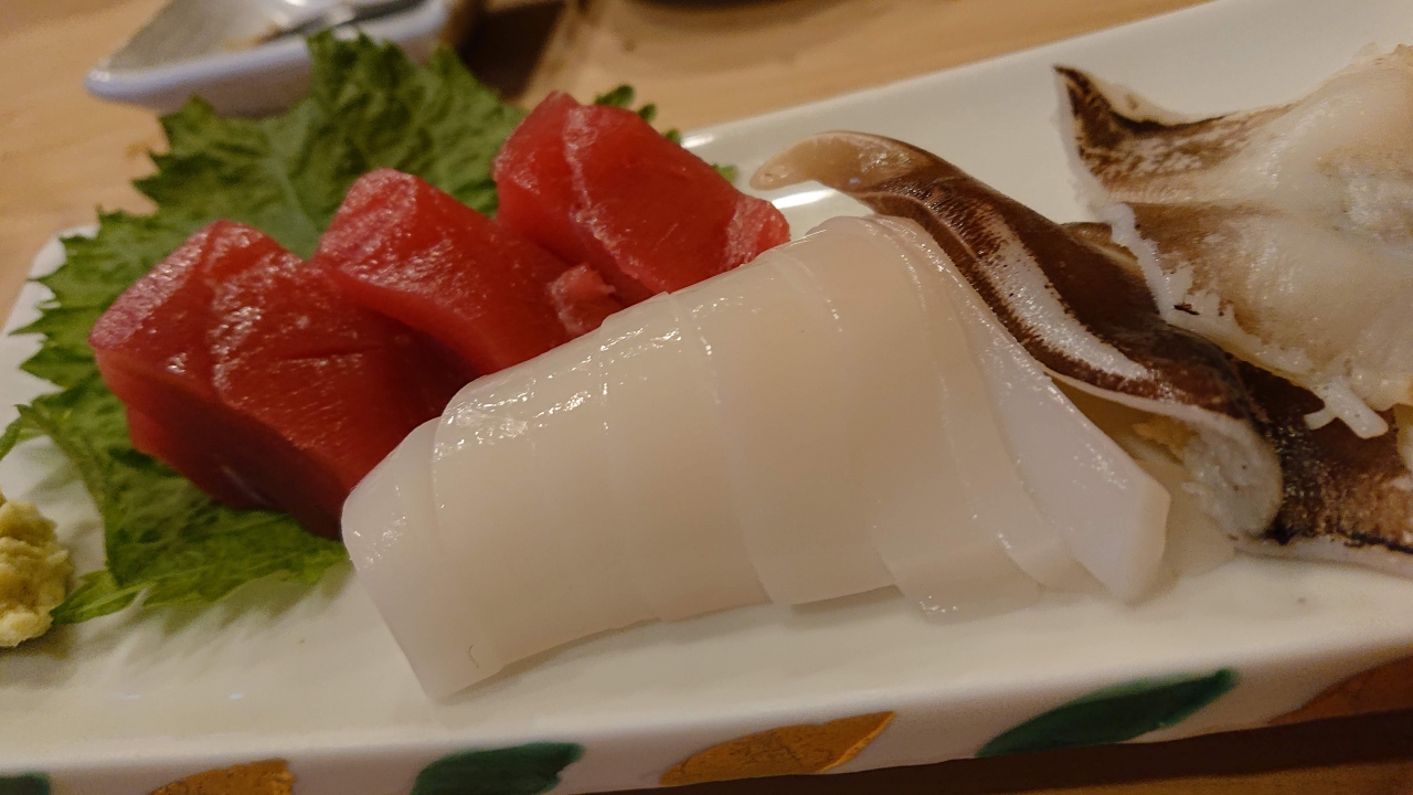 ビールとつまみに何か切ってくれと頼むと、自慢だというマグロとイカとトリガイが出された。