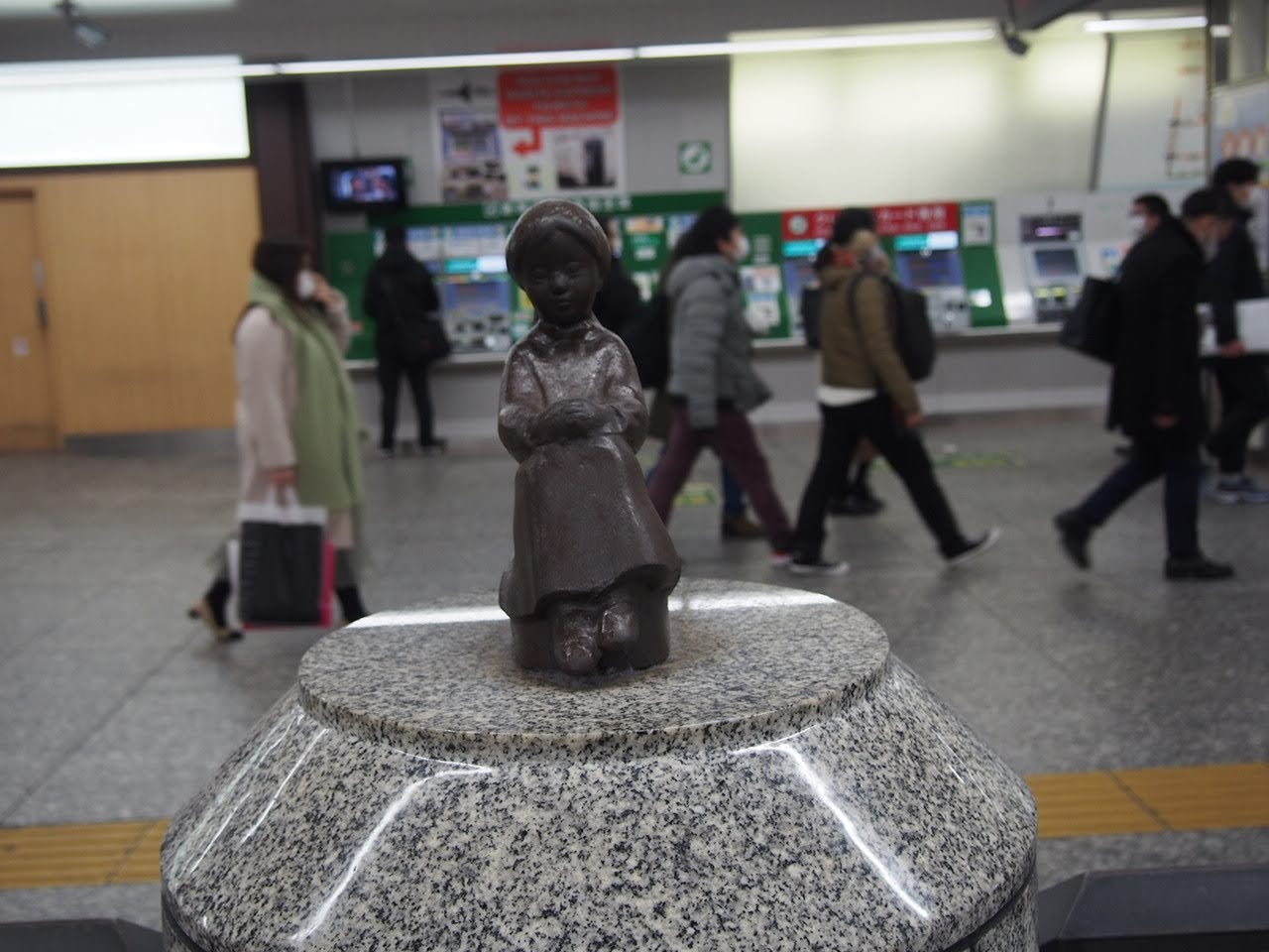 横浜駅の西口と東口を結ぶ自由通路のほぼ中ほどにあります。本家というか大元は山下公園にありますが、山下公園の物くらべ、こちらの像はかなり小さい。