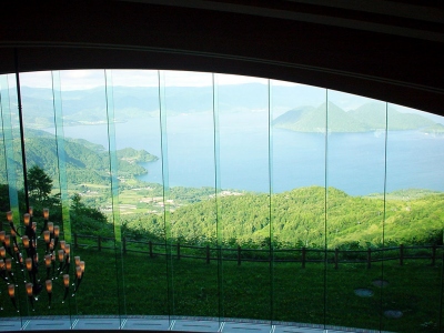 豪華なメインロビーのピクチャーウィンドウ越しに洞爺湖を見下ろす最高のロケーションは雲の上の別世界!