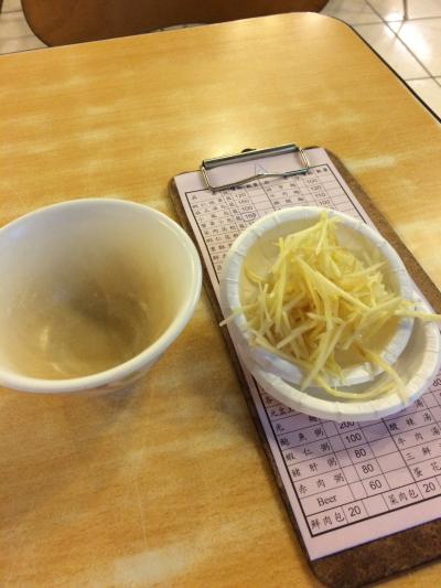 紙皿に入ったショウガとセルフサービスのお茶用のコップが運ばれてきました。