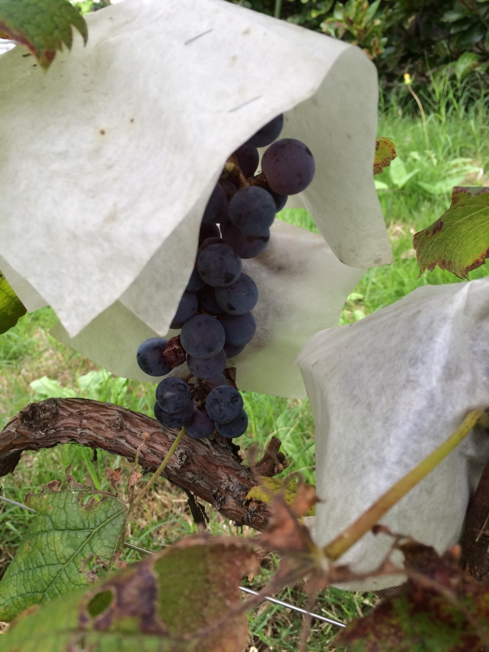 ワイン用のぶどうの実を味見していいよ。とのことで、赤・白用それぞれの実を木から直接摘みました。