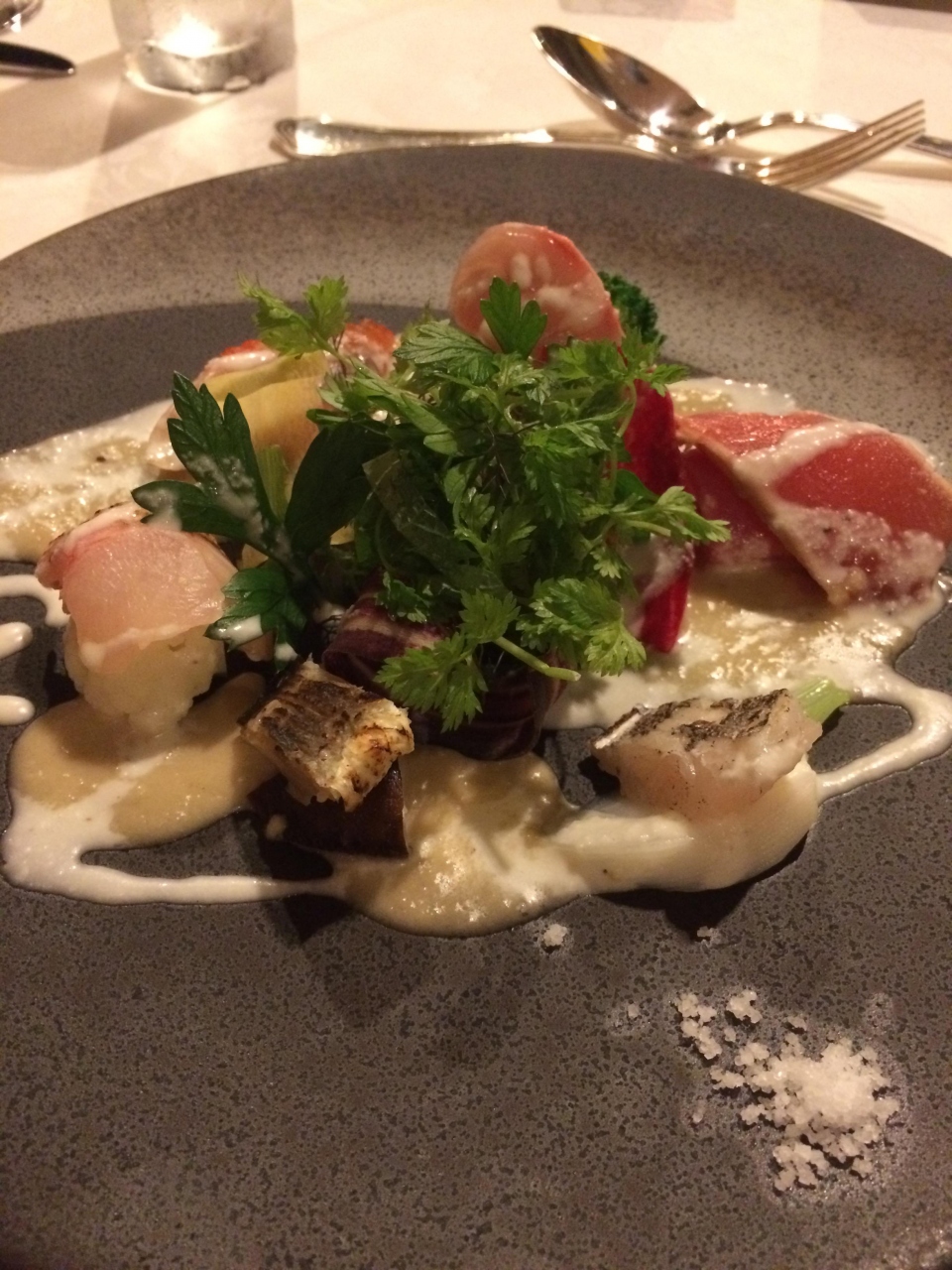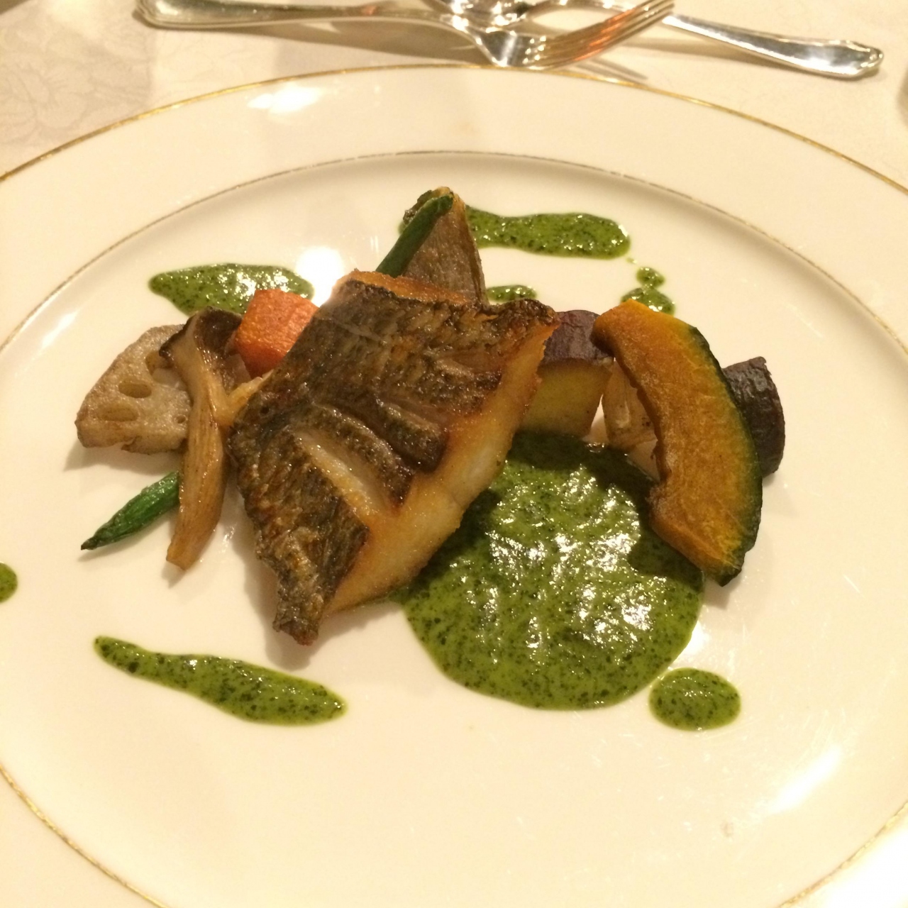 すぐに席に案内され、まずはスープが運ばれてきて、海老・青菜と続きます。