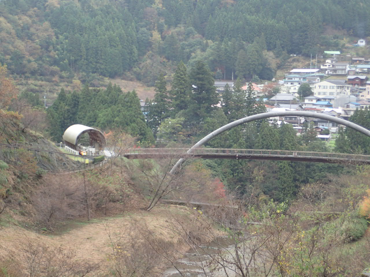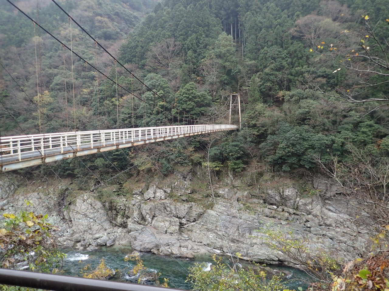国道32号線沿いにある、全長100mほどある国政のつり橋を初めて渡りました。何回も通っていましたが今回が初チャレンジ。車は国道沿いに止めて横断しますが、気をつけて渡ってください。いざつり橋につくと恐い。幅は1m50cmぐらいで下を見ると足がすくみます。風景は絶景ですが、高所恐怖症の人が無理かも。