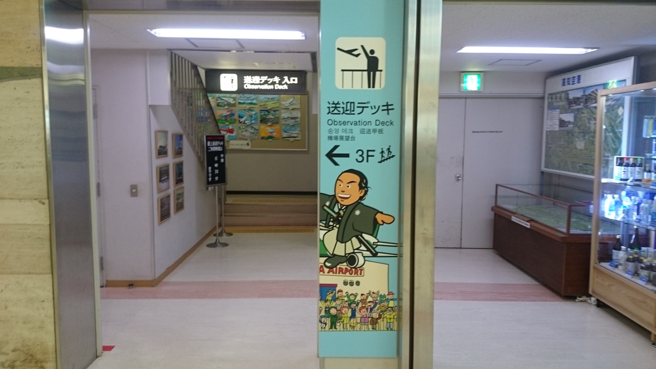 中へ入ると坂本龍馬のコーナーなどがありいろんなところで記念撮影ができるようになっています。3階へ上がると展望デッキになっており、小さな子供連れから飛行機好きの大人まで休みの日になるとたくさんの人が訪れています。空港内は、食事店等もあり待ち時間があっても暇はしないと思います。- 旅行時期
