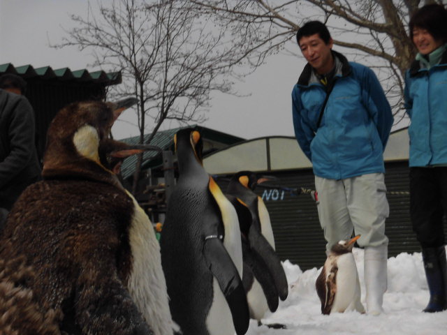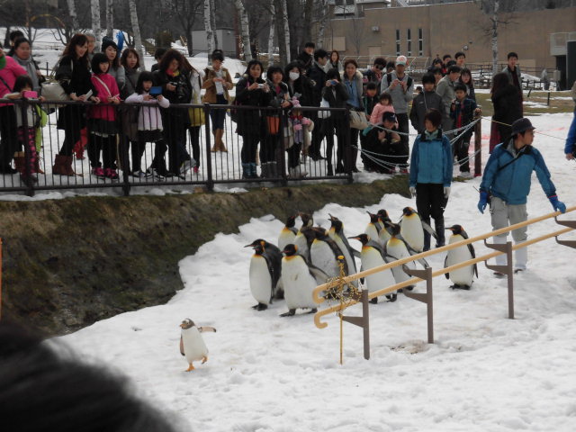 園内の雪をかき集めてペンギンのお散歩ルートを確保してくださっていたので、
