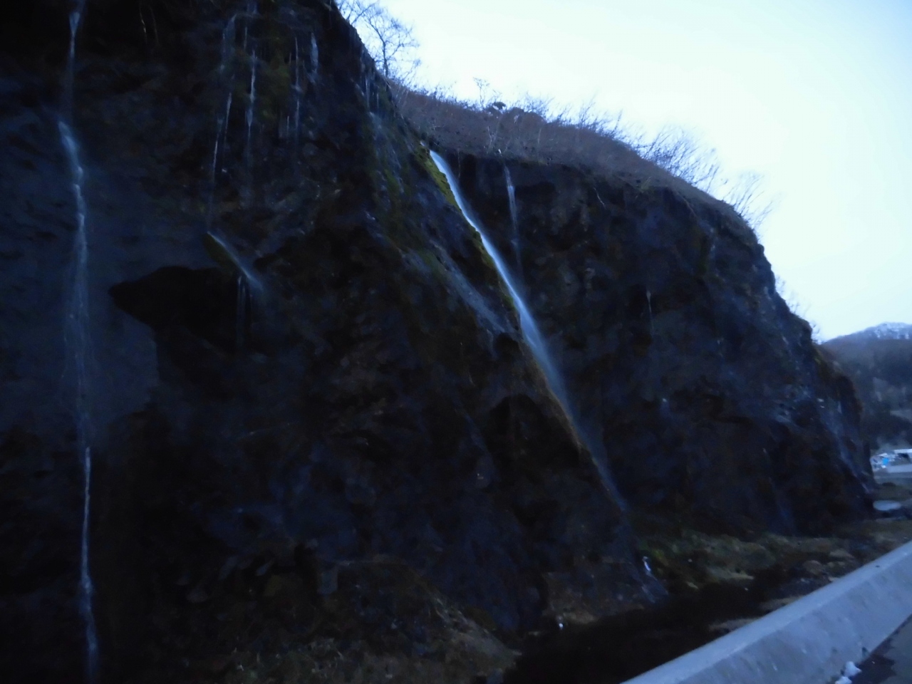 道路脇の岩肌に切れ目なく施された落石防止措置の数々、