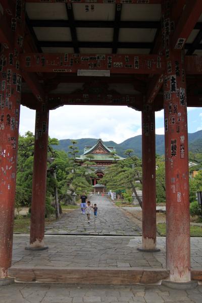 武田信玄が川中島の合戦の時に信濃善光寺の焼失を恐れ、1558年御本尊善光寺如来をはじめ、諸仏寺宝類を奉遷したことに始まりとされる甲斐善光寺。善光寺建築に特有の撞木造とよばれる形式で、総高27m総奥行49mという日本有数の木造建築として有名な金堂と山門は重要文化財に指定されています。金堂中陣天井には巨大な龍が二匹描かれていて吊り天井となっていることから手を叩くとと多重反響現象による共鳴が起こることから鳴き龍と呼ばれています。また本堂床下では長野善光寺と同じくお戒壇めぐりができます。善光寺は複数あり長野県の善光寺が最も有名ですがこちらもお戒壇めぐりができるため訪れた際は是非チャレンジしてみて下さい。