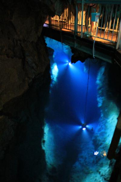 秋芳洞(山口県美祢市)・龍河洞(高知県香美市)と共に日本三大鍾乳洞に、また日本名水100選に選ばれた龍泉洞地底湖は国の天然記念物にも指定されています。全長は2.5km以上〜5km以上とも言われ、1962年に洞窟探検家が潜水事故を起こして以来、調査されていないため判然としていない。水深98mの第3地底湖、120m以上ある第4地底湖(未公開)等、全部で7つの地底湖を持っていることで知られています。観光整備のための工事中に龍泉洞入洞口の向かい側に新たに洞窟が発見された龍泉新洞も公開され洞内から土器・石器などが多数発見されています。洞窟内には、キクガシラコウモリ、コキクガシラコウモリ、モモジロコウモリ、ウサギコウモリ、テングコウモリの5種が確認され洞窟と共に「岩泉湧窟及びコウモリ」名義で国の天然記念物に指定されました。世界有数の透明度を誇り神秘的な龍泉洞から湧き出た水は主洞に沿って地下水流になり、数ヵ所で深い地底湖をたたえている龍泉洞地底湖はライトアップされた照明により幻想的な空間を演出されていました。洞内は真夏でも寒い位の温度のため薄着で入ると屋外との気温の差が大きいのでご注意下さい。また近隣に無料駐車場やお土産屋さんもあるため龍泉洞ご当地土産の購入もおススメです。