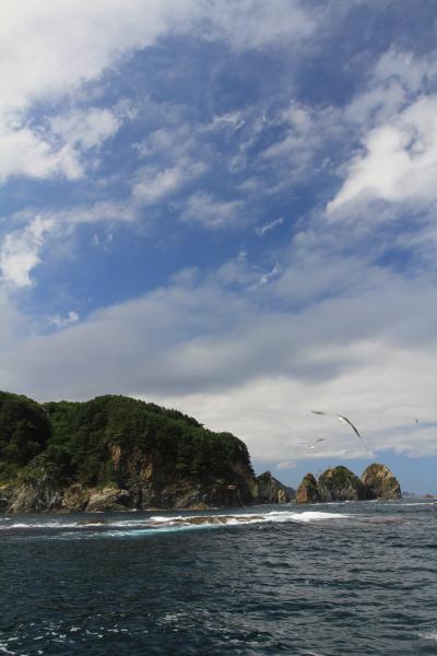 国指定名勝で陸中海岸国立公園に属し、三陸海岸を代表する景勝地として知られる浄土ヶ浜。環境省による快水浴場百選の他、日本の水浴場88選、かおり風景100選、日本の渚百選、日本の白砂青松100選にも指定されています。約5200万年前に形成された火山岩からなる白い岩塊と同色の小石によって囲われた入江は波が穏やかで外海と隔てられた空間を作っています。岩の上には常緑樹が生えていて日本庭園のような美しい景観が楽しめます。浄土ヶ浜の地名は約300年前に宮古山常安寺七世の霊鏡和尚が「さながら極楽浄土のごとし」と感嘆したことから名づけられたと言われています。潮吹穴は遊歩道からも行けるようですが、遊覧船がおススメです。遊覧船からの景観のため少し遠景となります。またタイミングが悪いと潮を吹く瞬間を見ることができず…