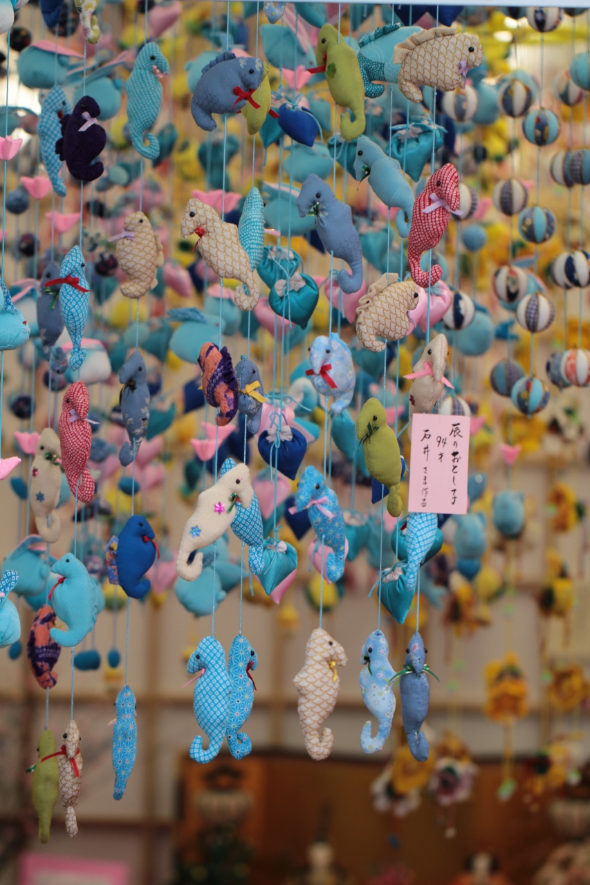 御宿と言えば夏の海・ビーチや伊勢海老祭りをイメージしますが、勝浦ビックひな祭りとは違った可愛らしいイベント「おんじゅくまちかど雛めぐり」が催されていました。こちらはひな人形というよりつるし雛がメインで御宿町の様々なお店で展示されている比較的小規模なイベントでした。メイン会場の「おんじゅく屋」で色鮮やかなつるし雛が飾られ、普通のひな人形も展示されており雛作成体験コーナーやつるし雛、あわび雛の販売、つるし雛制作キットの販売等もあり2月からひな祭りの3月3日頃まで開催されています。無料の駐車場もあるため徒歩で町の各所をぐるりと巡るってみるのもいいのではないでしょうか。つるし雛の可愛らしい姿は必見で御宿の夏のイメージを払拭してくれるイベントだと思います。