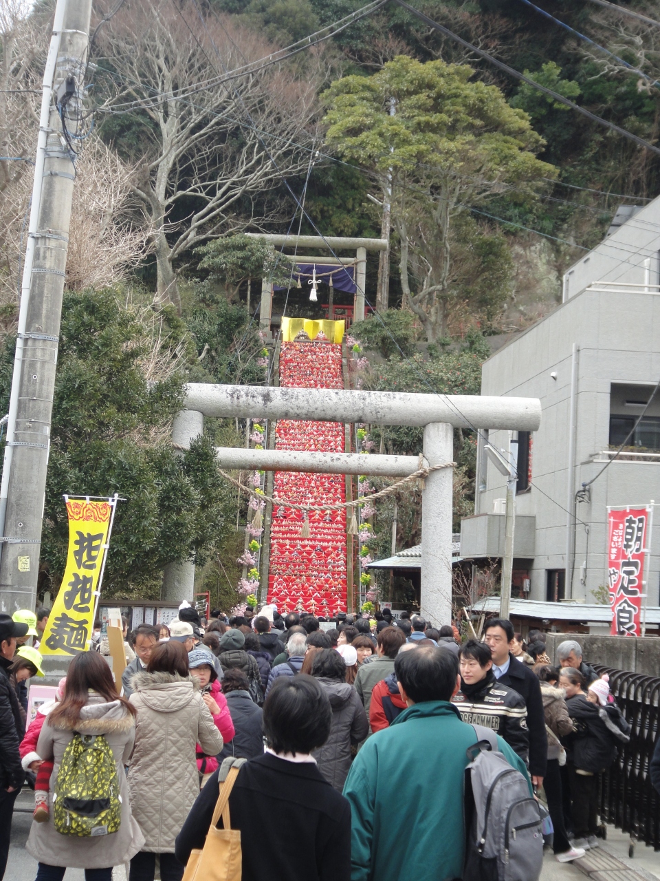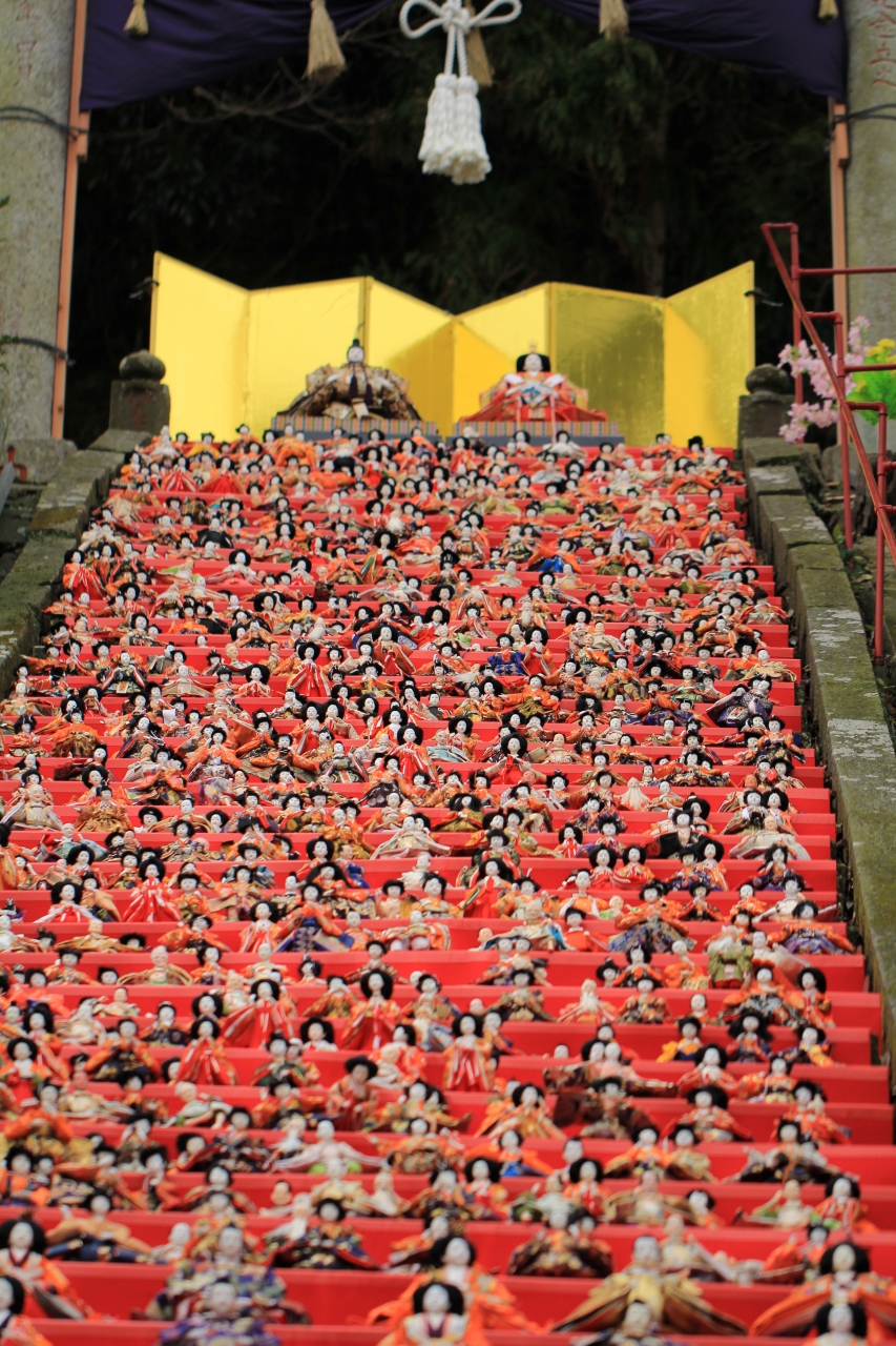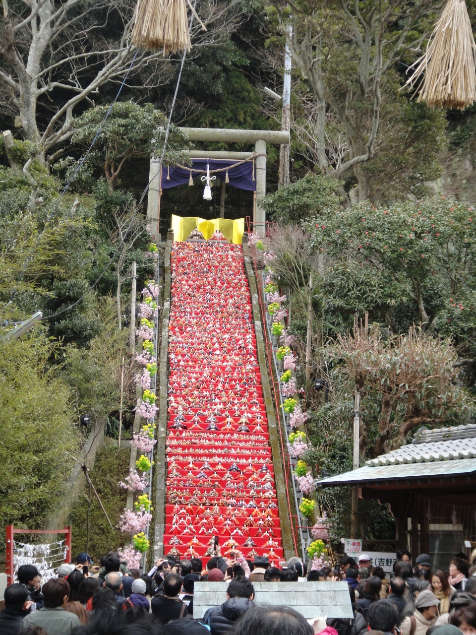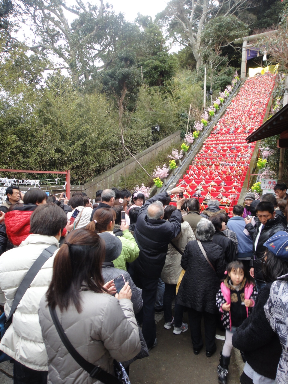 ビッグひな祭りは徳島県勝浦町が発祥の地とされており、のちにそれが派生する形で千葉県勝浦市、長野県須坂市においても開催されるようになりました。徳島県勝浦町より譲り受けた7千体を含む計3万体以上のひな人形が市街や開催会場各所に飾られています。メイン会場の遠見岬神社では参道の石階段60段に約1,200体のひな人形が展示され夜にはライトアップも実施、その光景は圧巻で最も賑わう会場で人混みの多さは他の会場に比して格段に多かったです。
