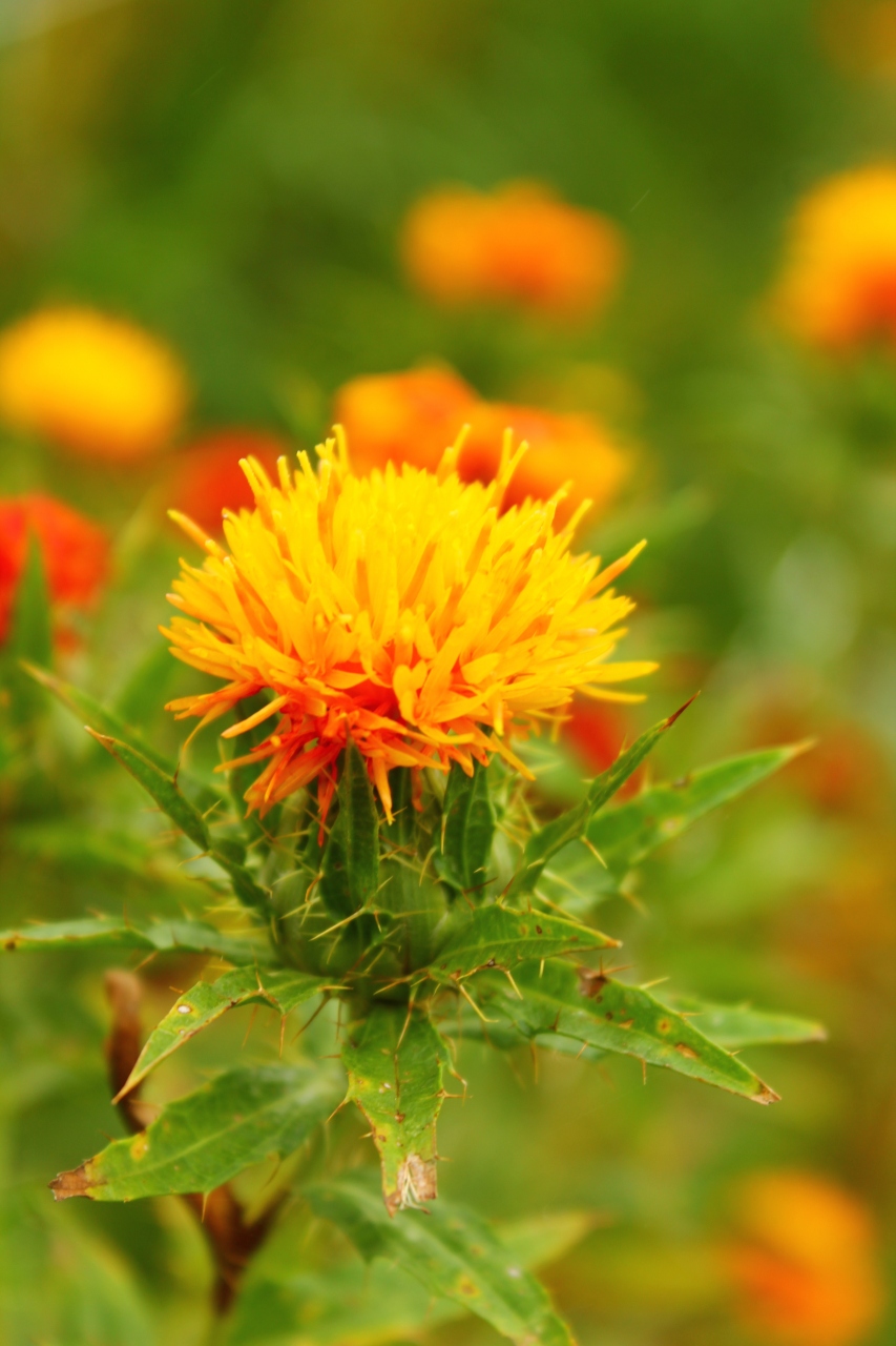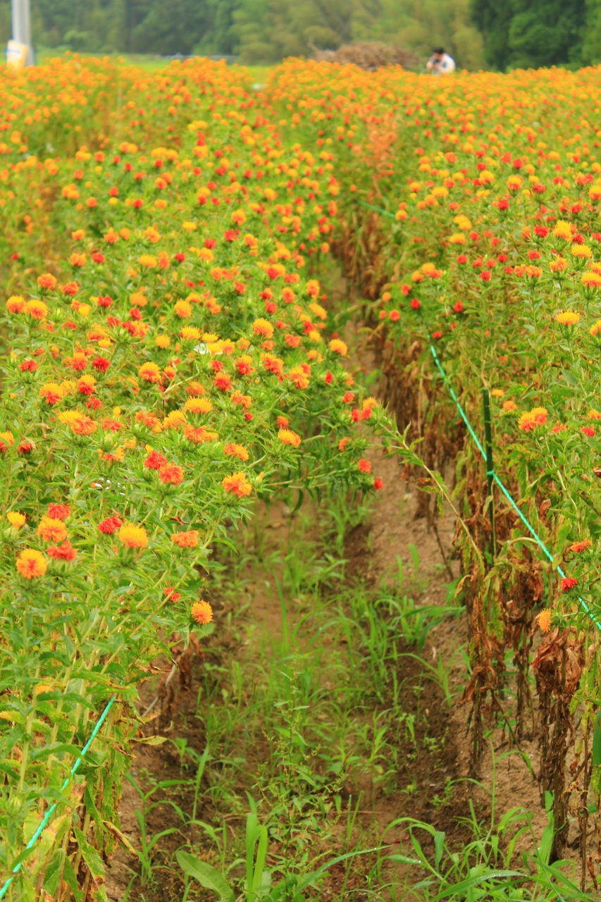長南町は紅花の産地で有名で、平安時代に千葉県長南町で盛んに栽培され、江戸時代中期以降は山形県最上地方や埼玉県桶川市、上尾市周辺でも盛んに栽培されたそうです。現在は中国産が主流となり、化学的に合成可能なアニリン染料が普及したことから、こうした紅花生産は急速に衰退し、現在では紅花染めや観光用などにわずかに栽培されています。平安時代に紅花で栄えた町「長南町」では毎年紅花のイベントが開催されています。
