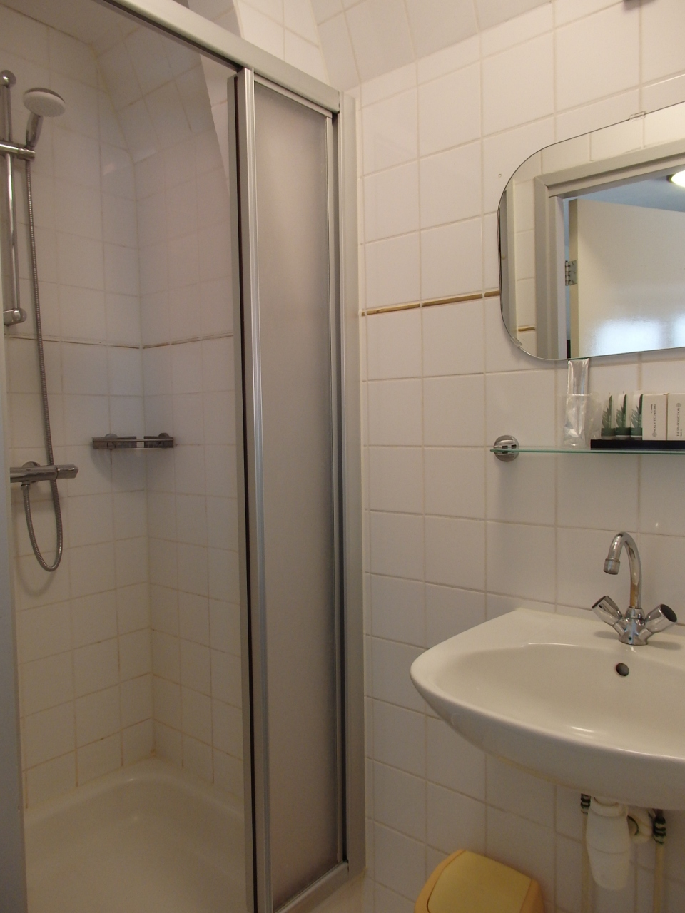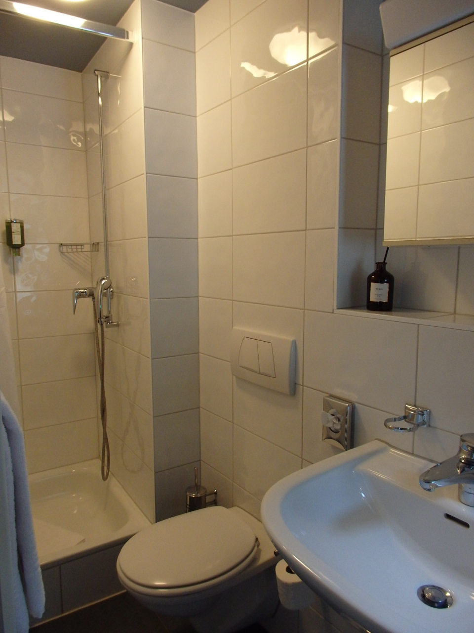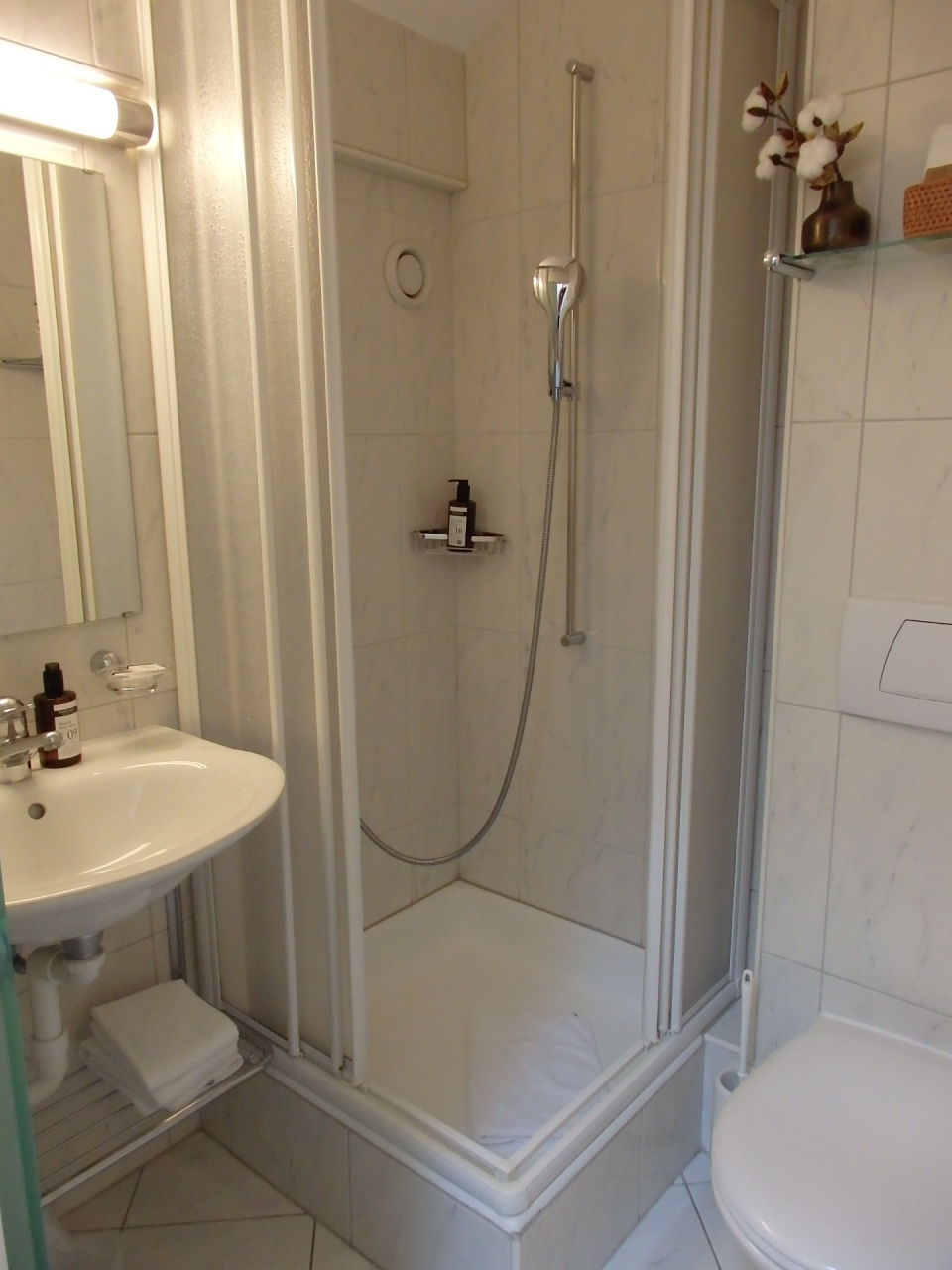 スモールシングルルームはロフト付きのお部屋で、急な梯子でベッドのある上の階のロフトに上るのも子供時代の探検気分を味わえ、結構楽しく感じました。下の階にはデスクセット、TV、TEL、ミニバー、クローゼット(ソーイングセット、室内金庫、ハンガー10本付き)、電気ポットとコーヒー紅茶セット、肘掛け椅子などが備わっていました。バスルームはシャワーオンリーですがすぐに熱いお湯が出て、少し弱めの水圧ですが温度調節しやすく水捌けも良好、ドライヤー、バニティセット、箱ティッシュ、ローション、タオルは大中小2枚ずつ用意されていました。
