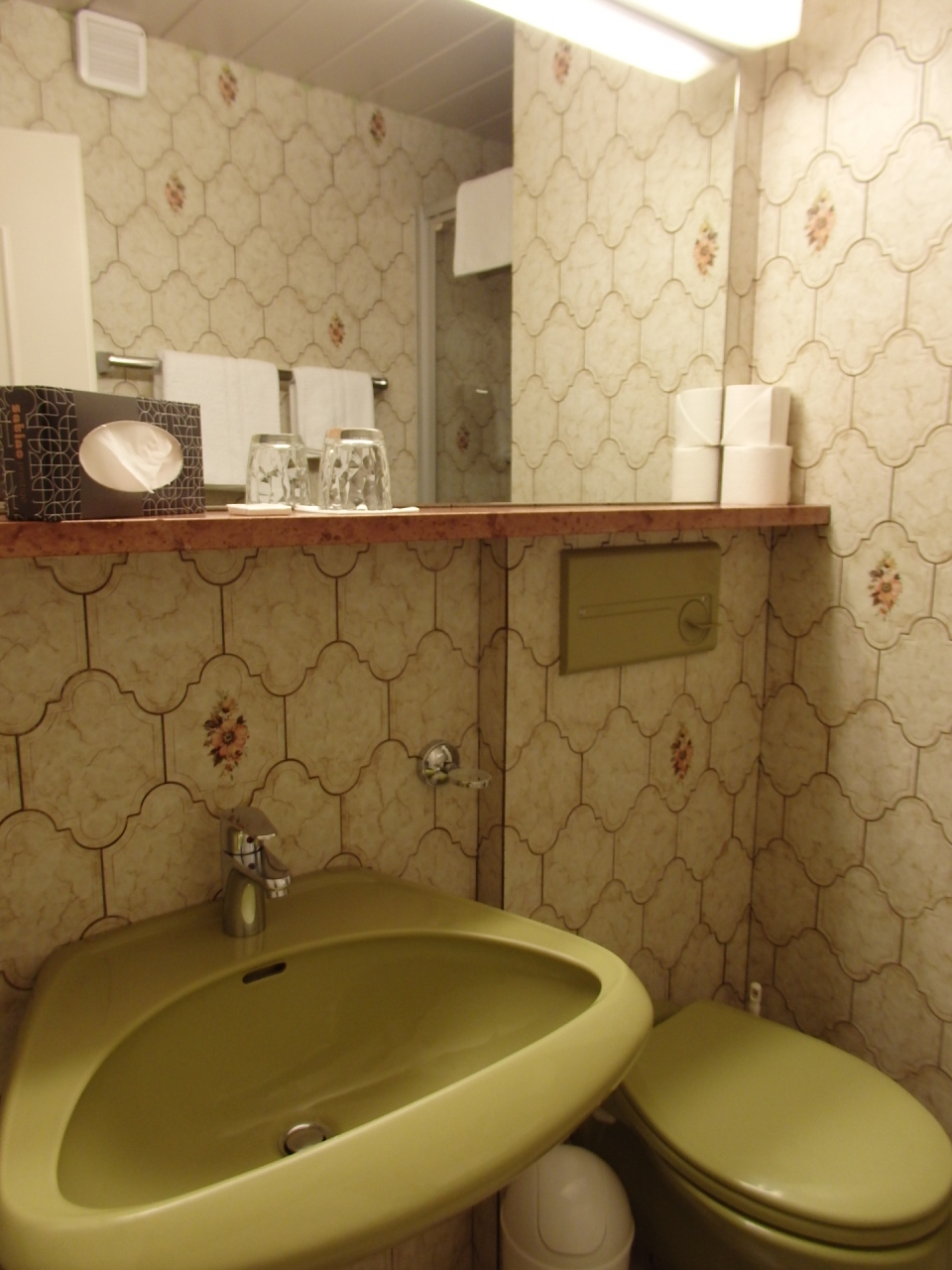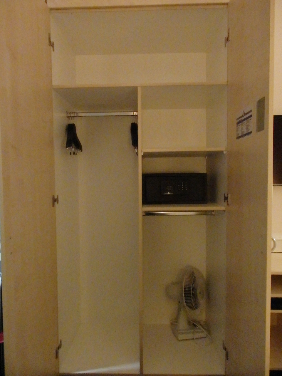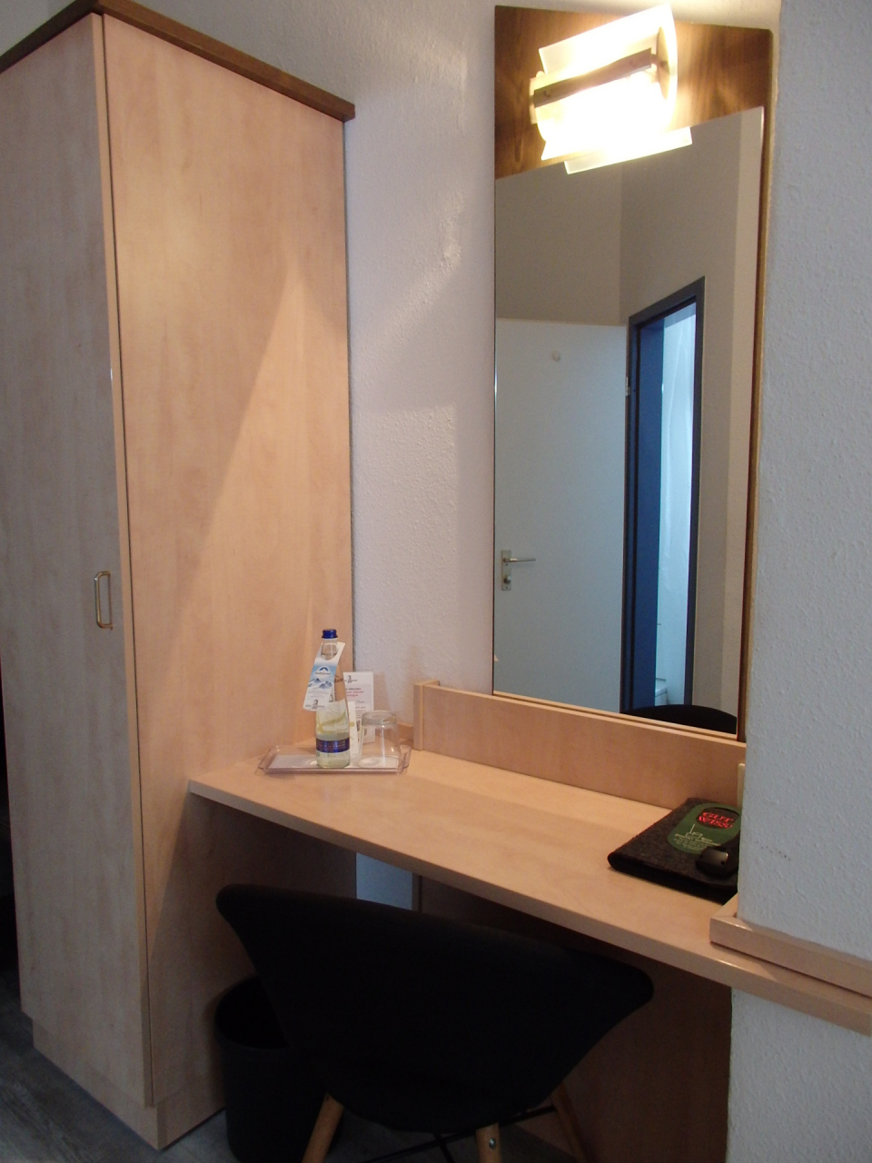 スモールシングルルームはロフト付きのお部屋で、急な梯子でベッドのある上の階のロフトに上るのも子供時代の探検気分を味わえ、結構楽しく感じました。下の階にはデスクセット、TV、TEL、ミニバー、クローゼット(ソーイングセット、室内金庫、ハンガー10本付き)、電気ポットとコーヒー紅茶セット、肘掛け椅子などが備わっていました。バスルームはシャワーオンリーですがすぐに熱いお湯が出て、少し弱めの水圧ですが温度調節しやすく水捌けも良好、ドライヤー、バニティセット、箱ティッシュ、ローション、タオルは大中小2枚ずつ用意されていました。