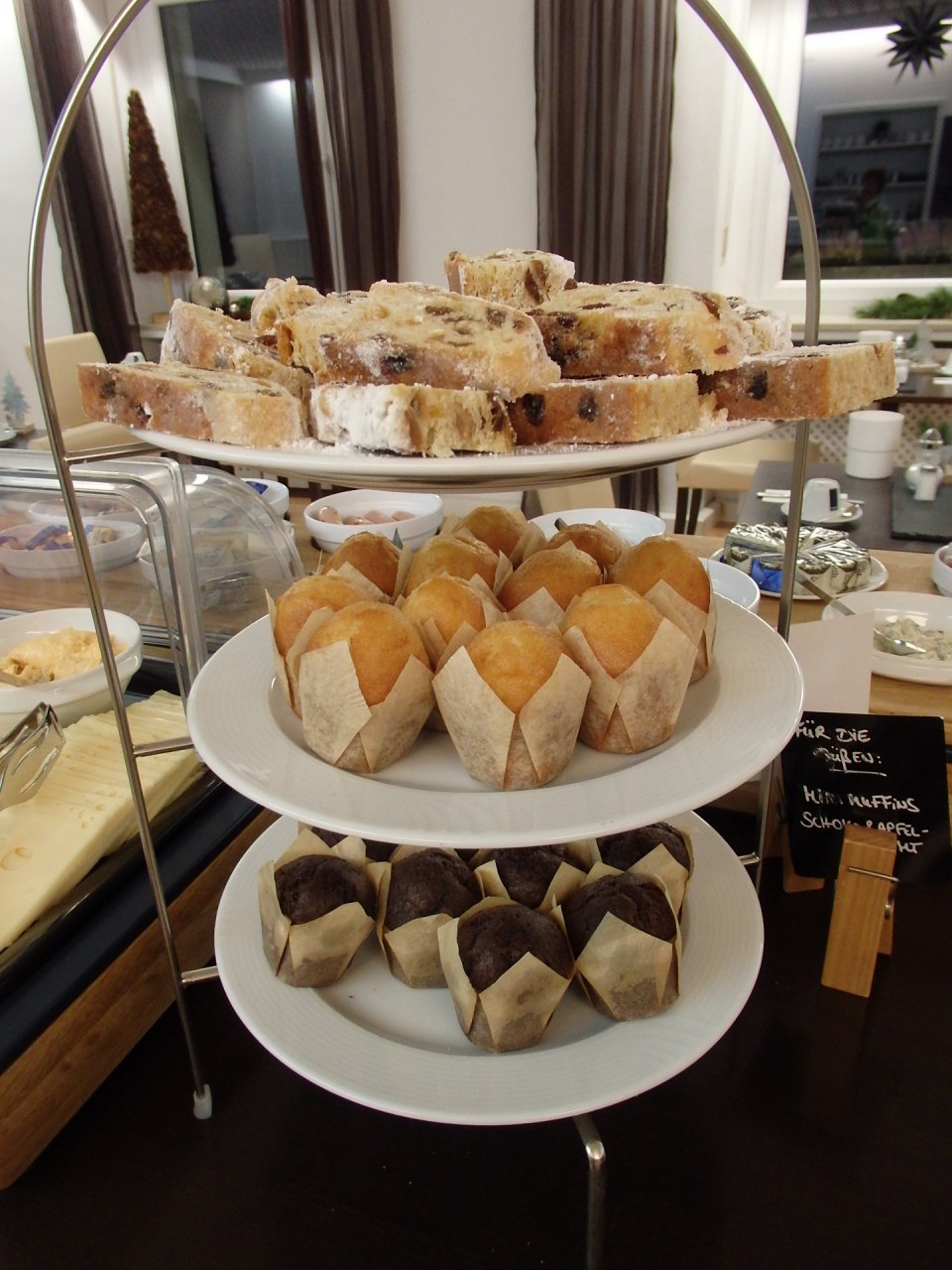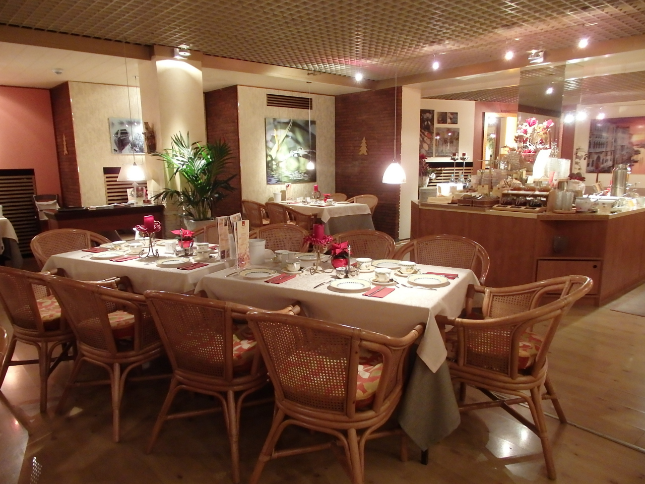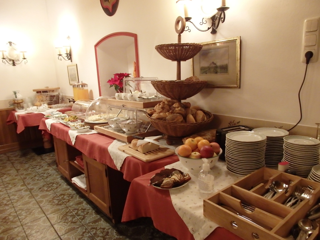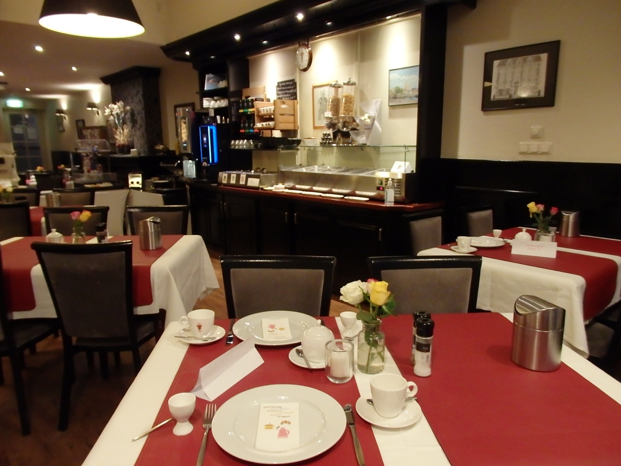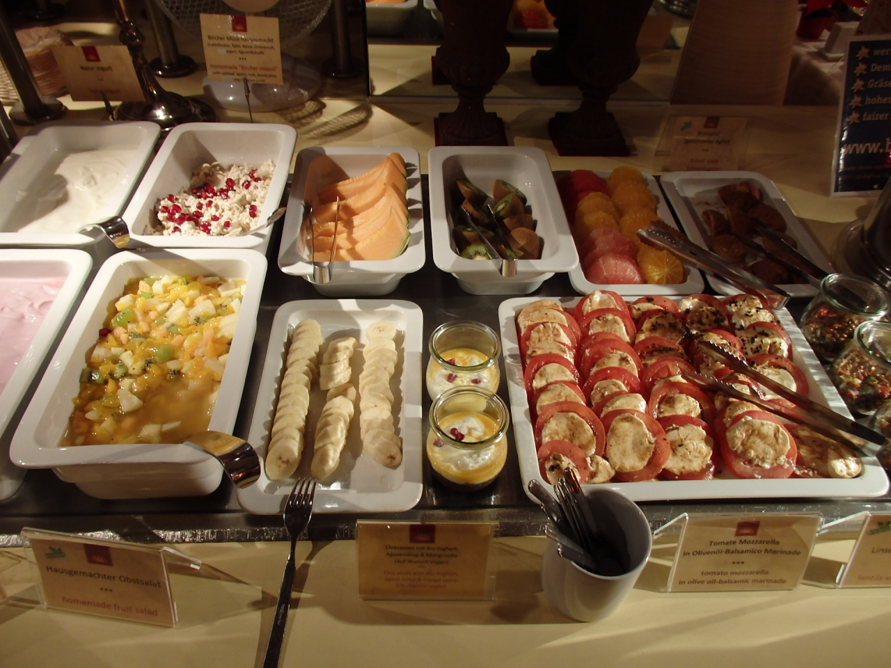 朝食ルームにはビュッフェ台が並ぶスペースのほかにテーブルが並ぶ部屋が3室に分かれ、7:00~10:00の間の利用です。多種類のハム&チーズ、パプリカにトマトやキュウリ、ピクルス、ゆで卵、ヨーグルトやフルーツ、スプレッドに手作りジャム各種、シリアル類などが並びます。- 旅行時期
