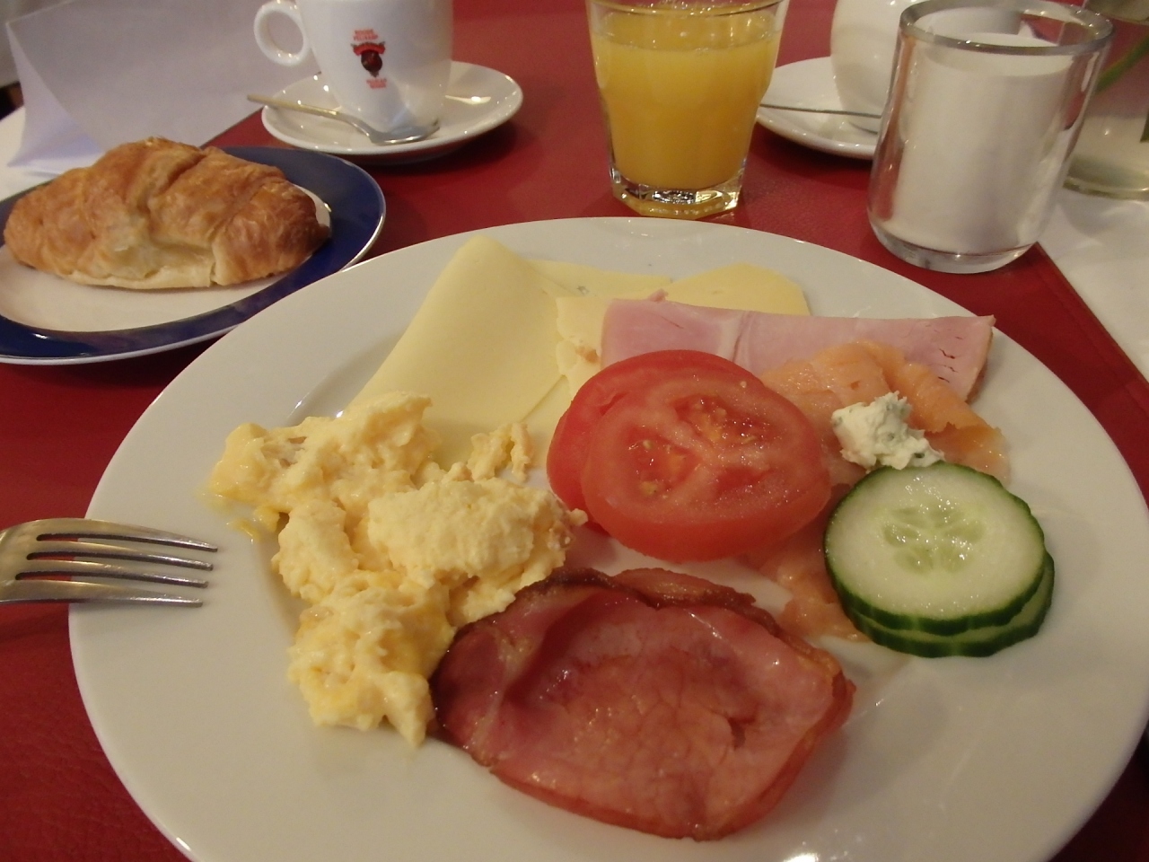 朝食はビュッフェ式で6:30~10:00、コールドメニューは数種類のハム&チーズ、スモークサーモン、トマトやキュウリ、シリアル類、マヨネーズサラダ、フルーツ、ヨーグルトなど。ホットメニューは定番ですが茹で卵にスクランブルエッグ、ベーコン。パンの種類が多く、焼きたてクロワッサンも用意されています。