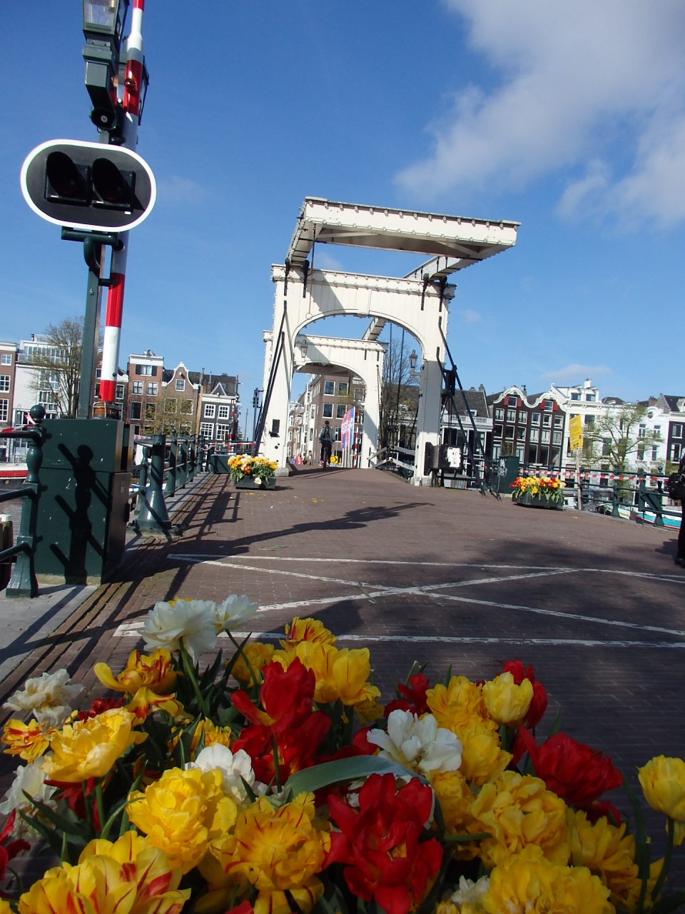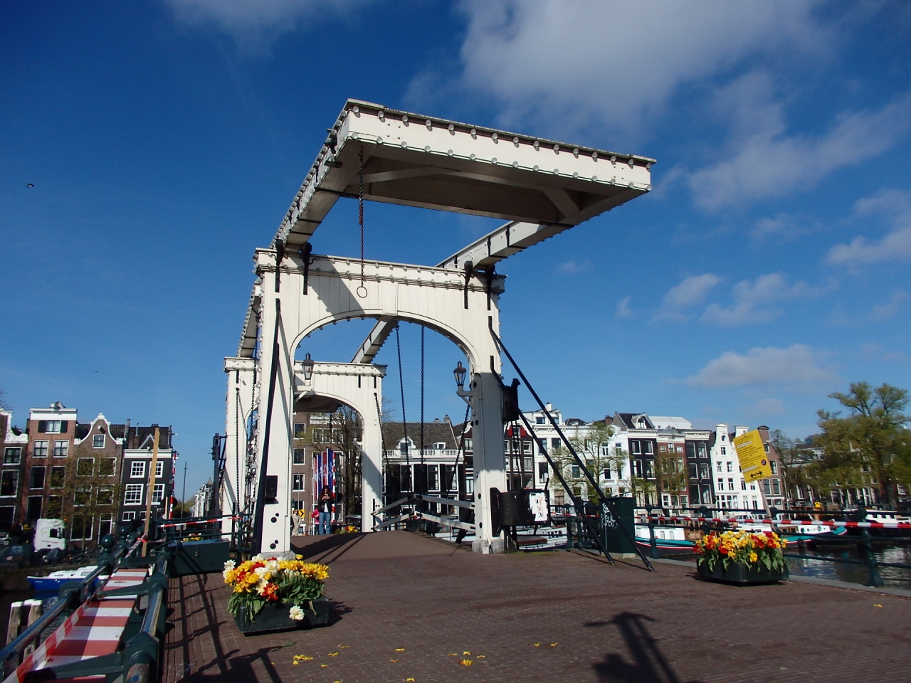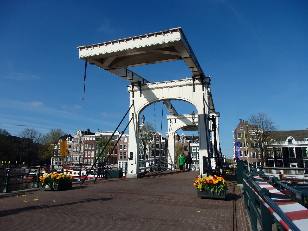 「マヘレの跳ね橋」は、1671年建造のアムステルダムで唯一の木造の跳ね橋。ゴッホが描いた「アルルの跳ね橋」に似た橋で、マヘレは「細い橋」を意味し、1934年に一度取り壊され、同じデザインの橋に置き換えられました。1994年までは手動で開閉されていたそうです。夜にはライトアップされ、幻想的な姿が浮かび上がります。- 旅行時期