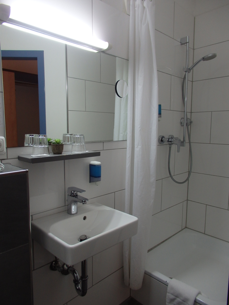 シャワーのみのバスルームは、手狭でお湯が出るまで少し時間がかかりますが、水圧・温度調節・水捌けが良好。アメニティはボトルシャンプーと石鹸のみ。