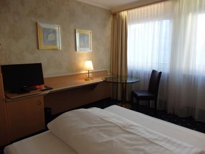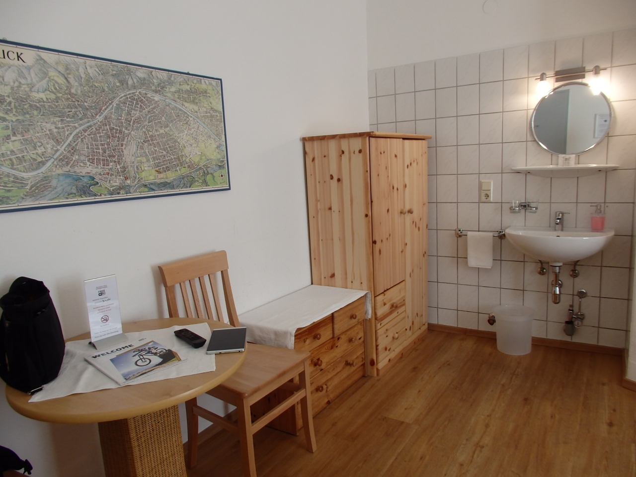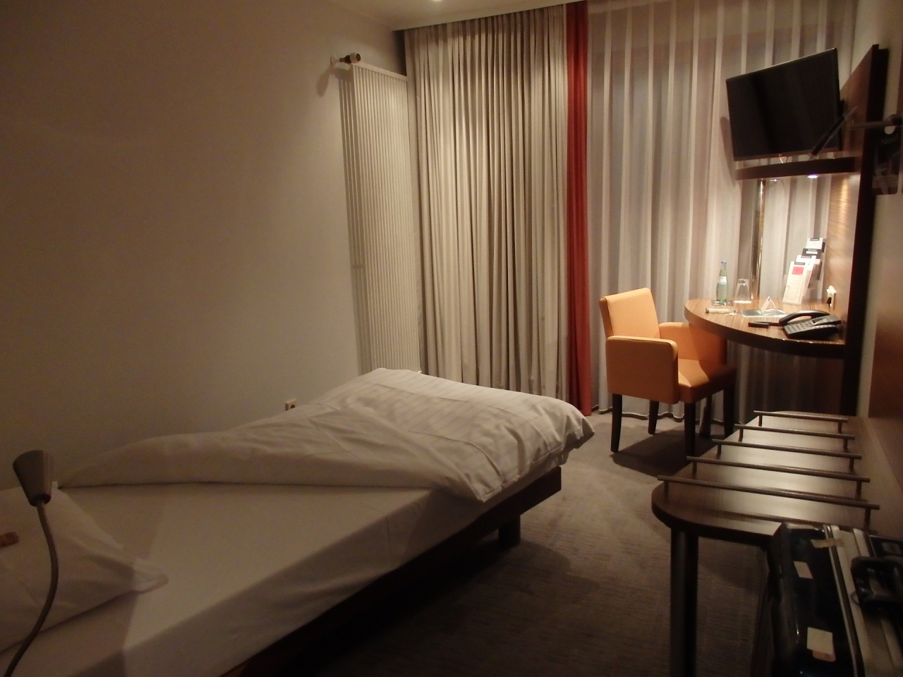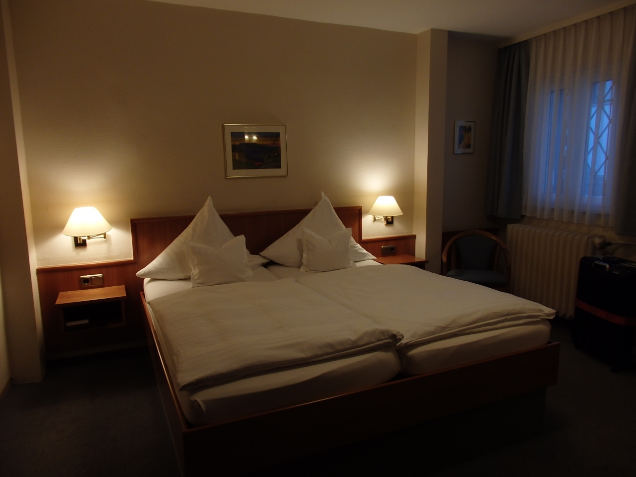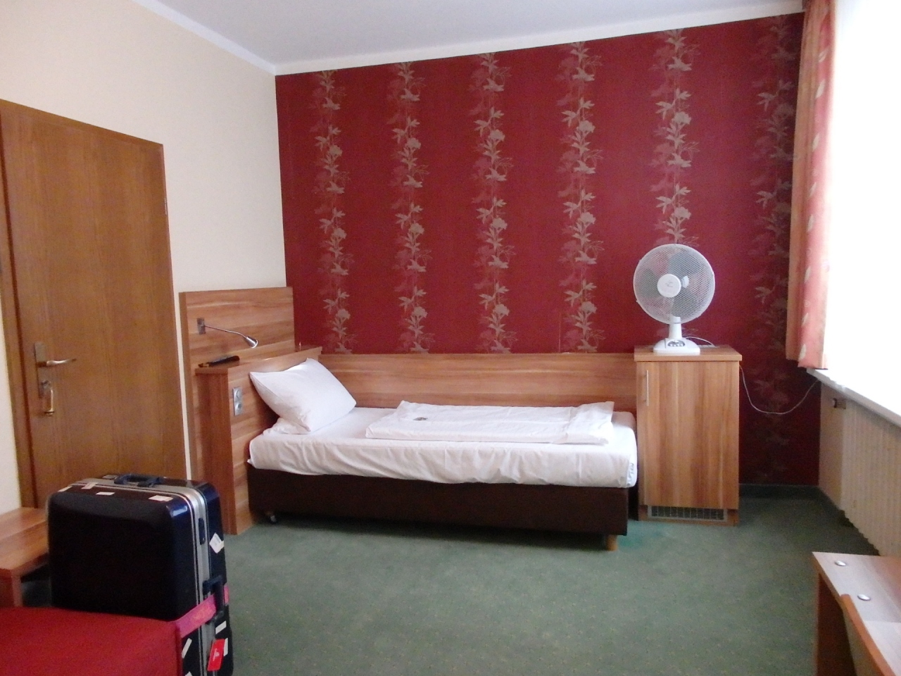 ミュンヘン中央駅から徒歩5分。ダブルルームのゆったりしたお部屋で、バスタブ付きのバスルームは、シャワーの勢いが弱く、水捌けもあまりよくありません。エアコンがない代わりに扇風機が置いてあります。広いテーブルは使い勝手が良く、TV、TEL、ドライヤー、ミニバー、箱入りティッシュ、使いやすい位置に3カ所コンセントがあり、不自由なく過ごせました。