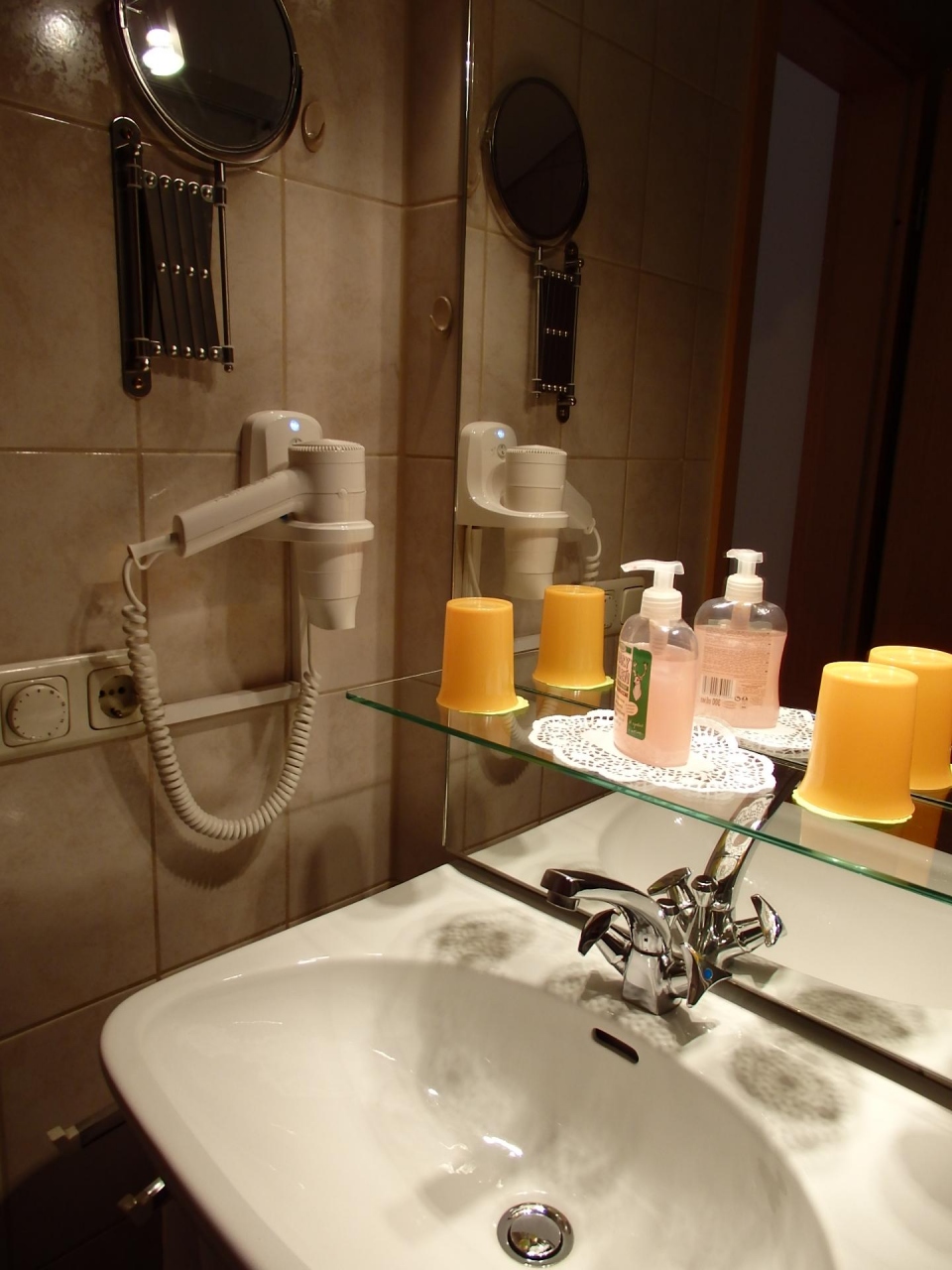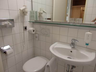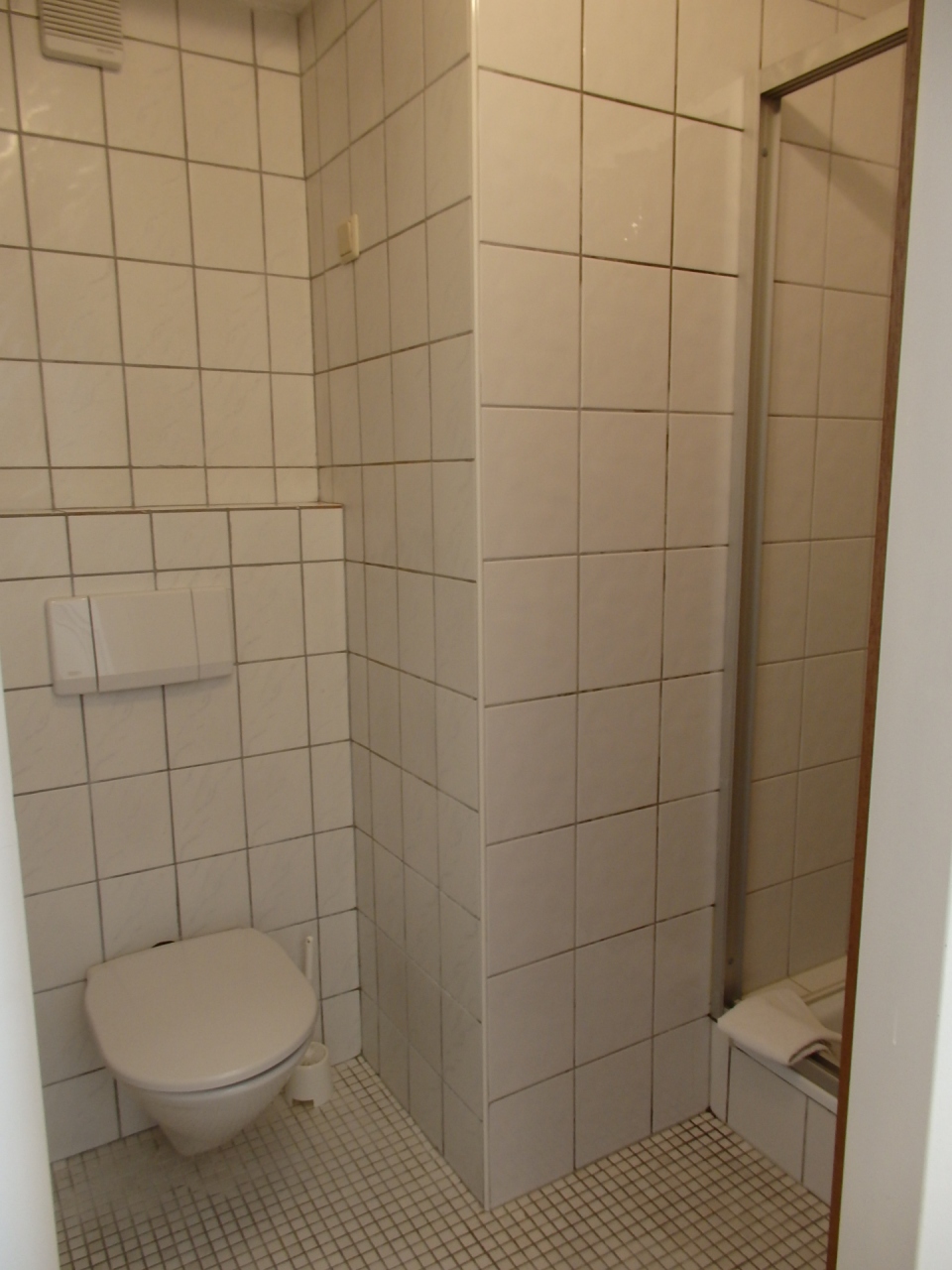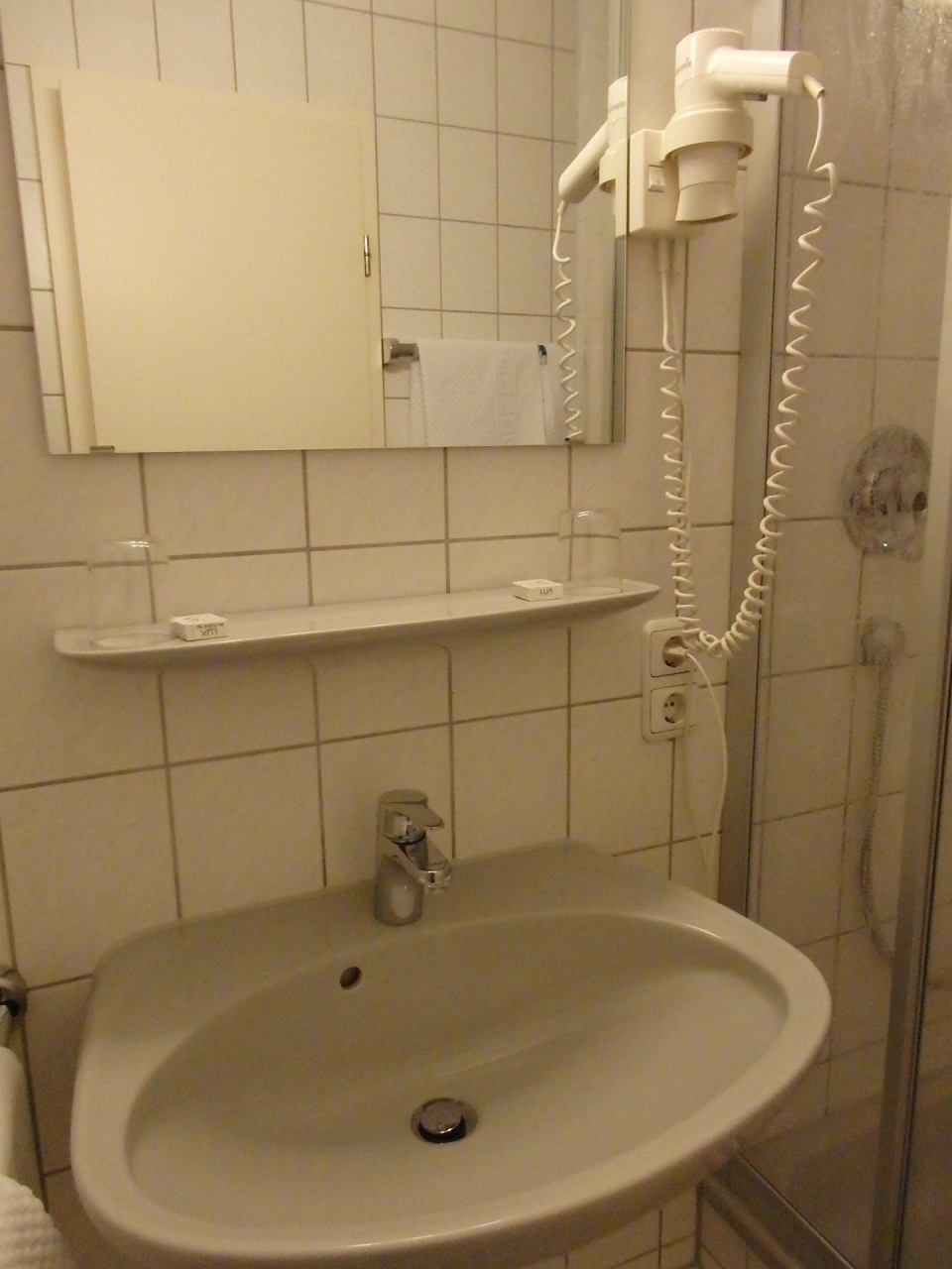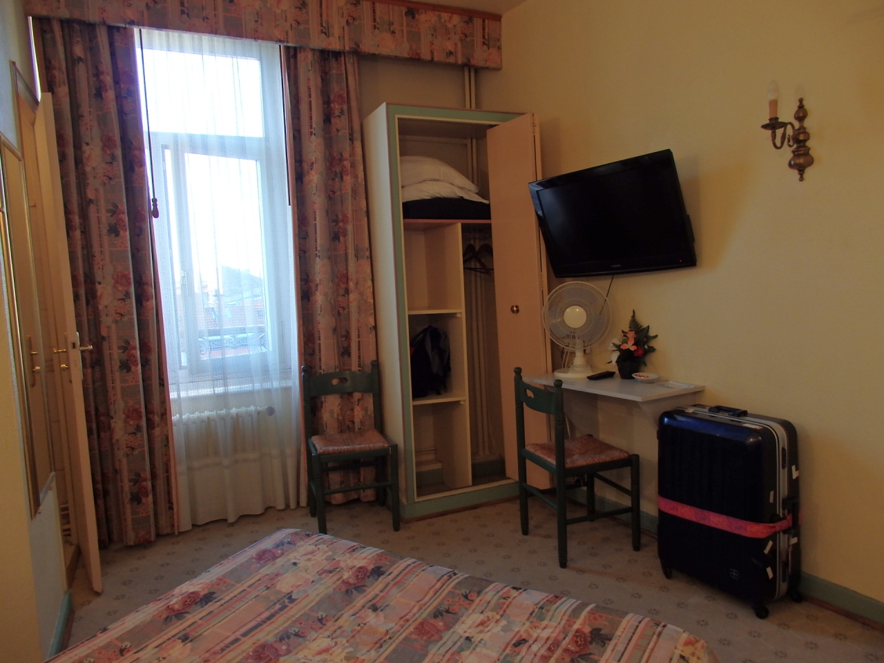 ミュンヘン中央駅から徒歩5分。ダブルルームのゆったりしたお部屋で、バスタブ付きのバスルームは、シャワーの勢いが弱く、水捌けもあまりよくありません。エアコンがない代わりに扇風機が置いてあります。広いテーブルは使い勝手が良く、TV、TEL、ドライヤー、ミニバー、箱入りティッシュ、使いやすい位置に3カ所コンセントがあり、不自由なく過ごせました。