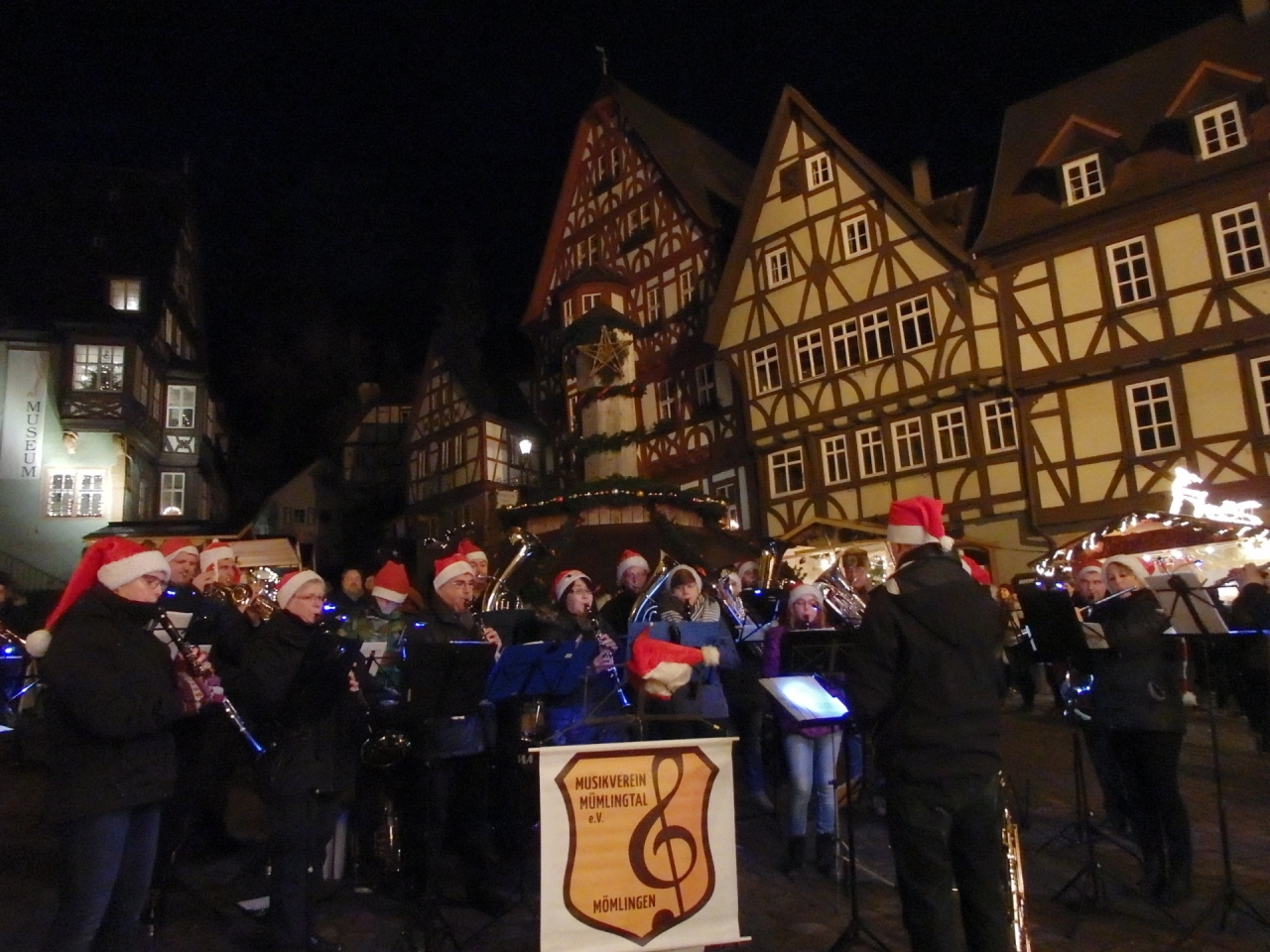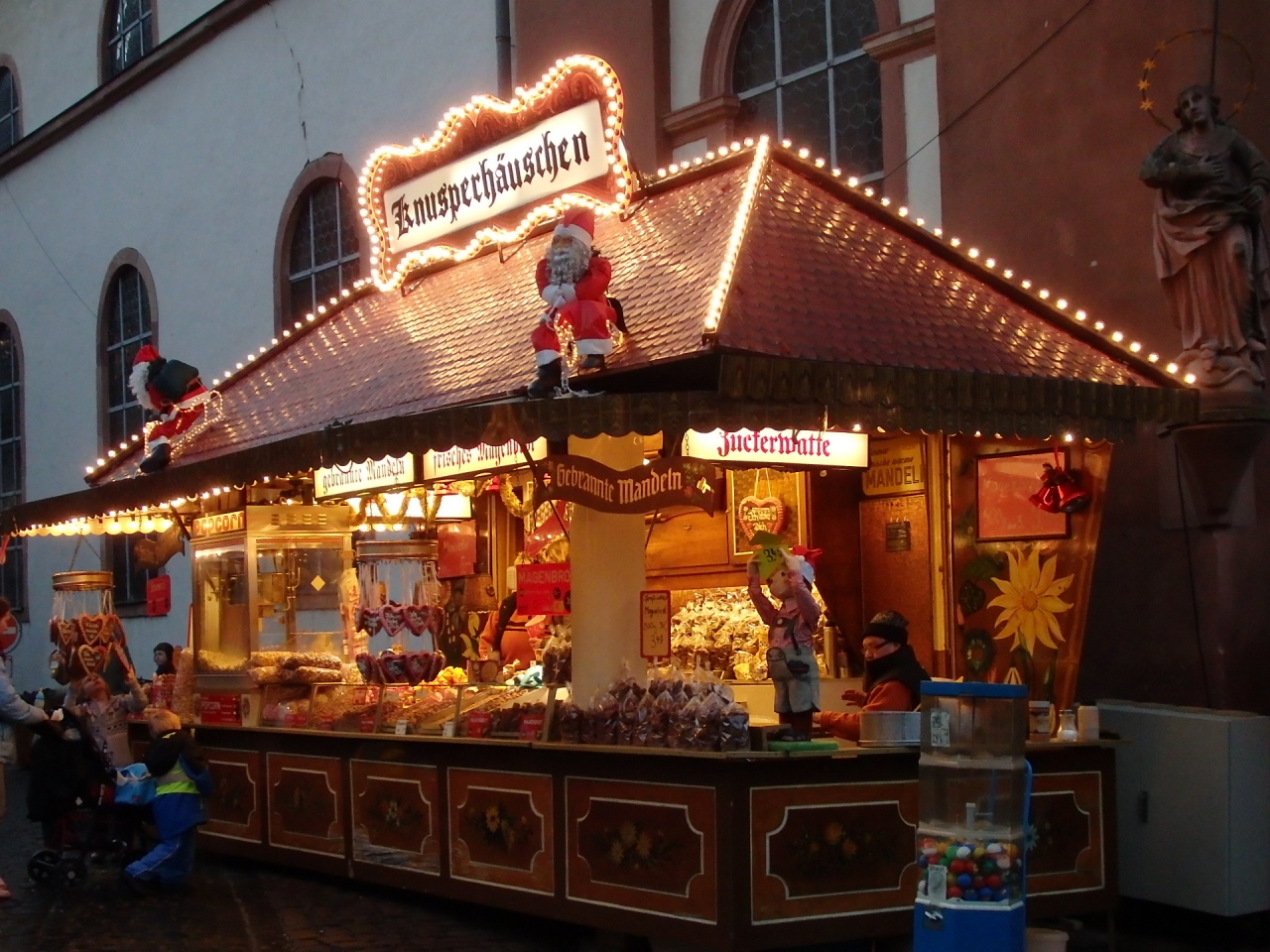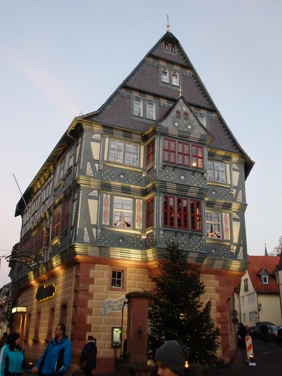 旧市街のメインストリート・ハウプト通りに入って、門を背に右方向へ歩くこと数分でマルクト広場に出ます。マルクト広場とそれまでの通り沿いには、見事な木組みの家々が建ち並びます。特にハウプト通りの中ほどにある緑っぽい色調の建物は、ガストハウス・ツム・リーゼンといって、ホテル・レストランとなっていて、16世紀の建造で立派なものです。また、マルクト広場で一際豪華な赤い木枠の建物は、これもホテル・レストランとなっていて、目を惹きます。広場の中央には噴水があり、クリスマスシーズンには、エンジェル広場やハウプト通りと同様、ここもクリスマスマーケットが繰り広げられ、大変な賑わいよう!特に噴水前では、演奏や合唱を披露してくれる時間帯もありますので、どうぞ楽しんできてください。グリューワインは、他の所に比べると、香辛料で噎せ返るのが比較的少ないようで、飲みやすかったです。