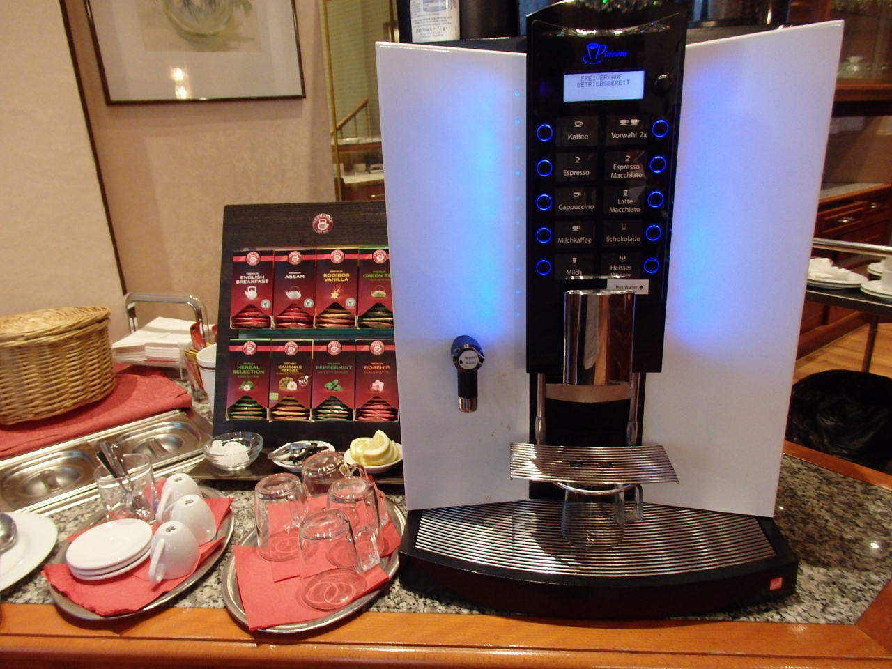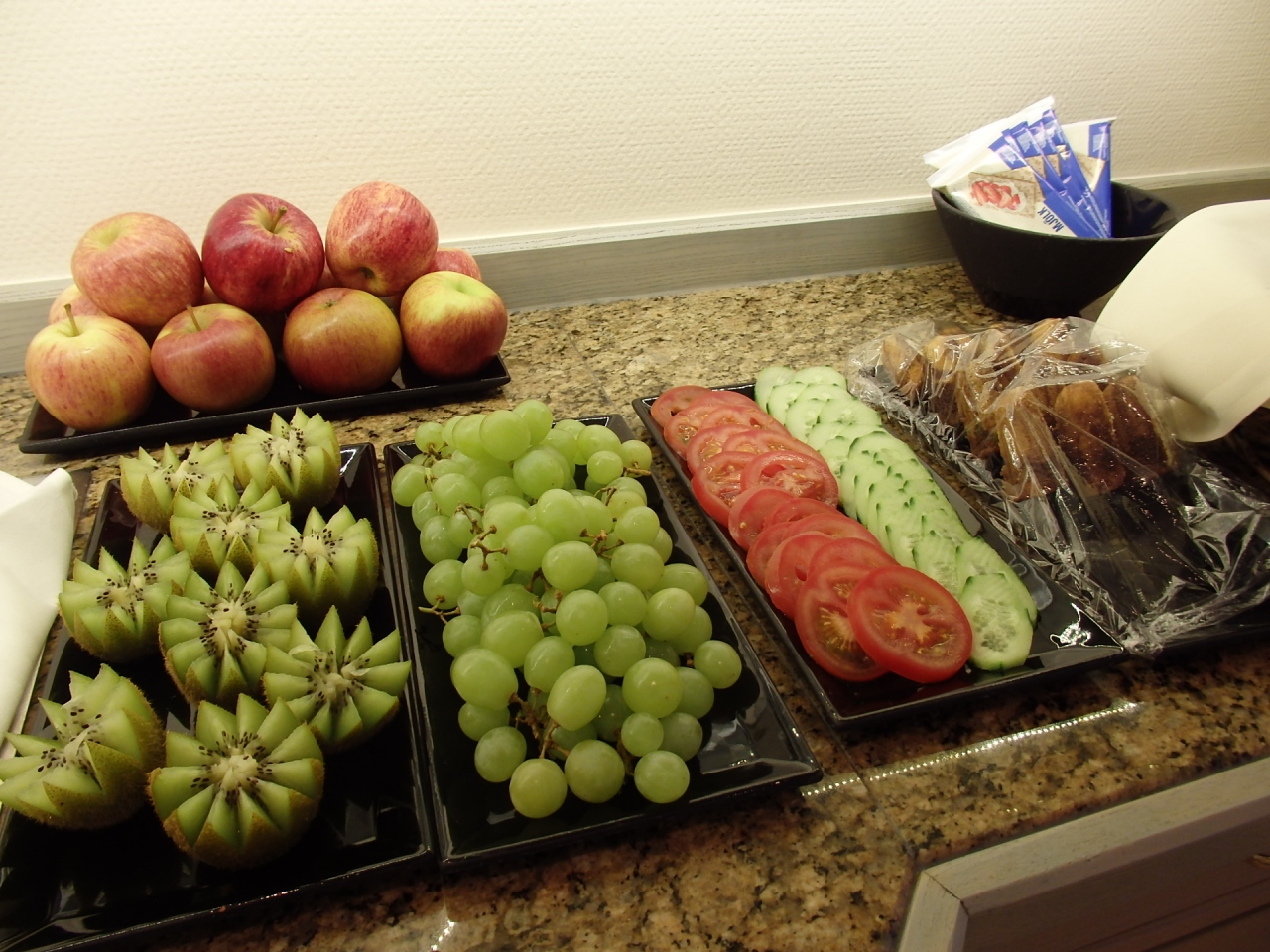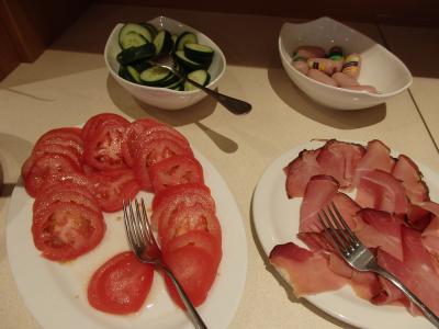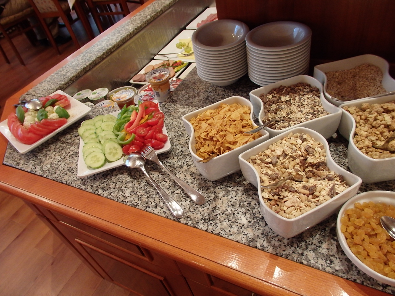 朝食は、7時からですが、ちょうどに行くともうすでに食べている人もいたので、早めにっても大丈夫なようでした。多種類のハム&チーズ、生ハム、トマトやキュウリやパプリカの野菜類、オリーブに、トマト&チーズ、シリアル類、フルーツ、ヨーグルト、多種類のパンにデニッシュにクロワッサン、アップルケーキ、ジュース、ホットドリンク・・・と美味しくいただけました。卵料理は個別に頼むと作ってテーブルまで運んでくれます。