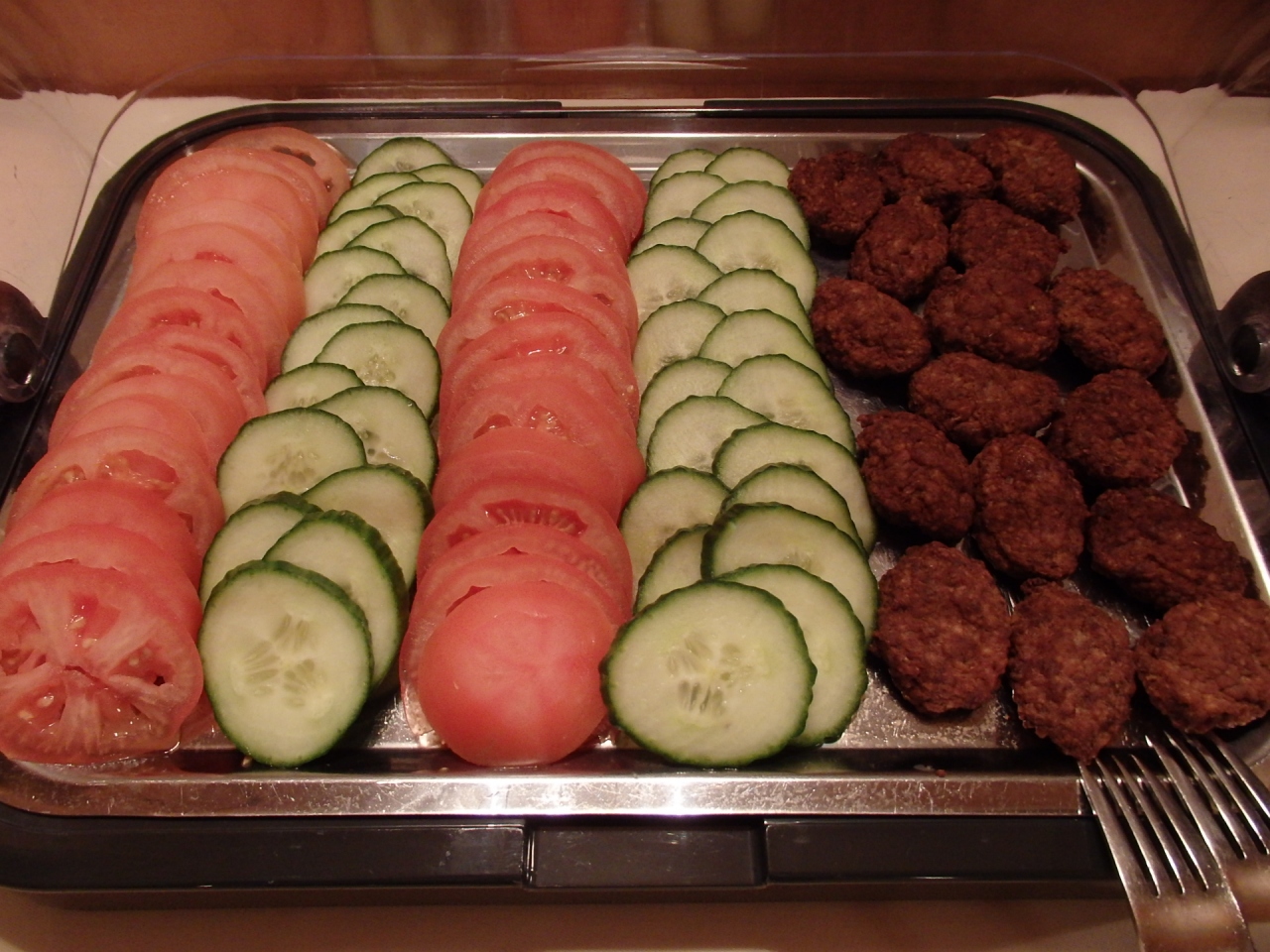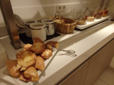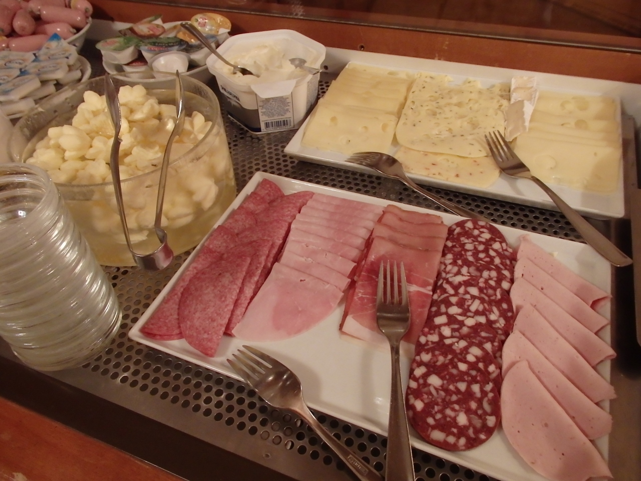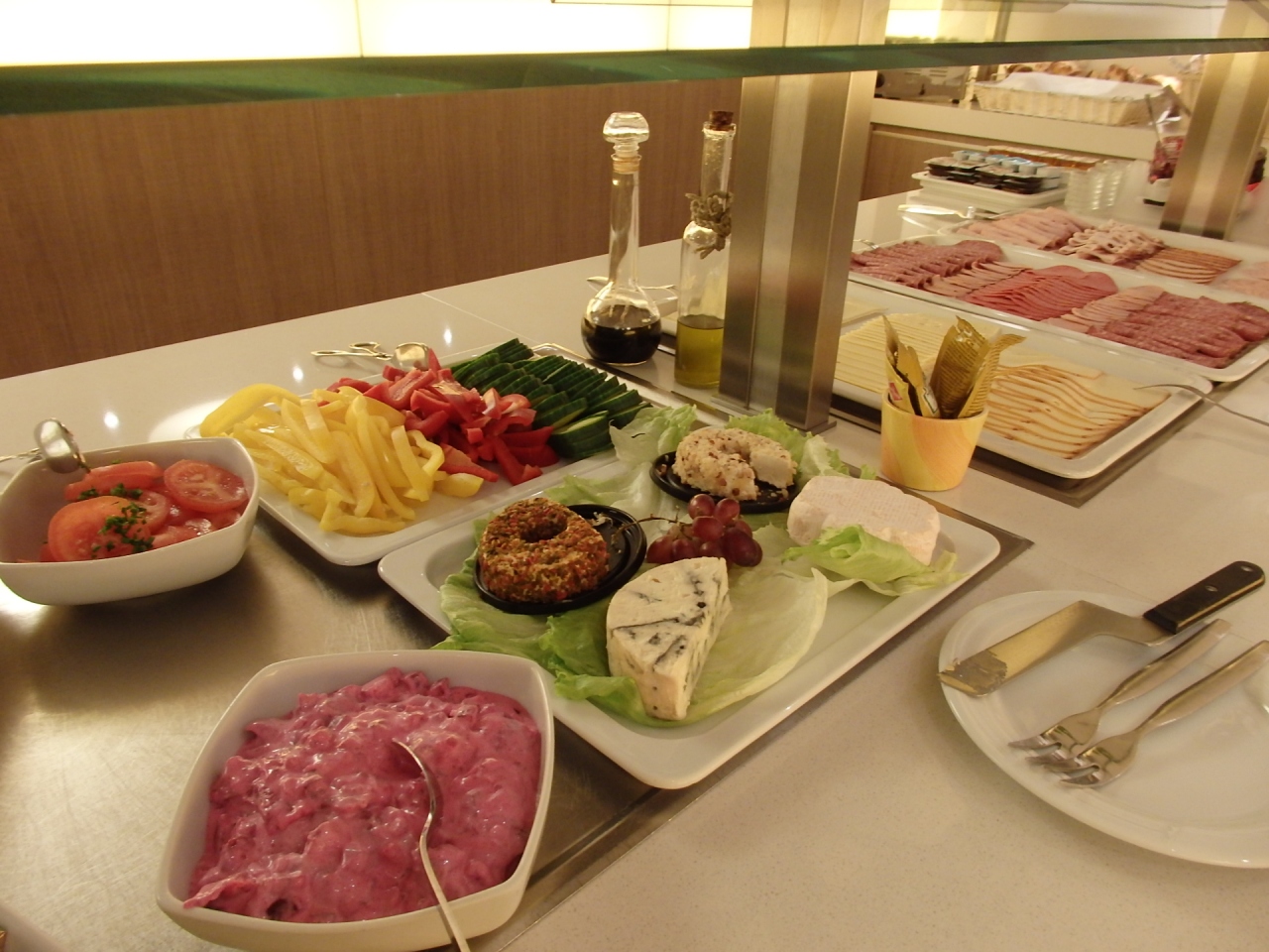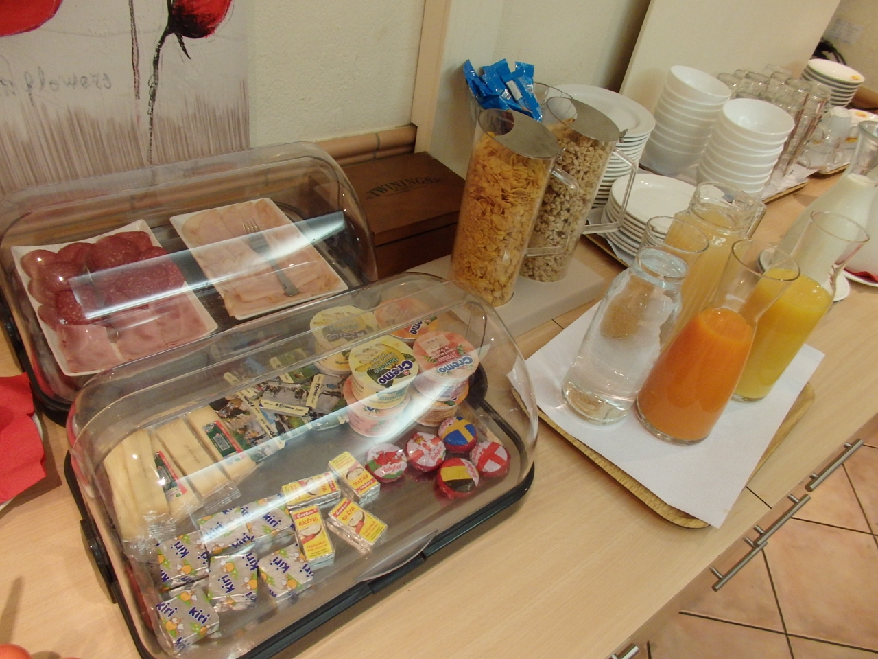 8.9ユーロで追加の朝食は、6:00~10:00、温かいメニューはスクランブルエッグやゆで卵、ベーコンに焼きソーセージ、ミニハンバーグなど。冷たいメニューは、多種類のハム&チーズ、トマトやキュウリ・パプリカ・ピクルス、ヨーグルト、フルーツ、シリアル類、ミニデニッシュに数種類のパン、ジュースにホットドリンクなどありました。カプチーノも頼めば持って来てくれます。- 旅行時期