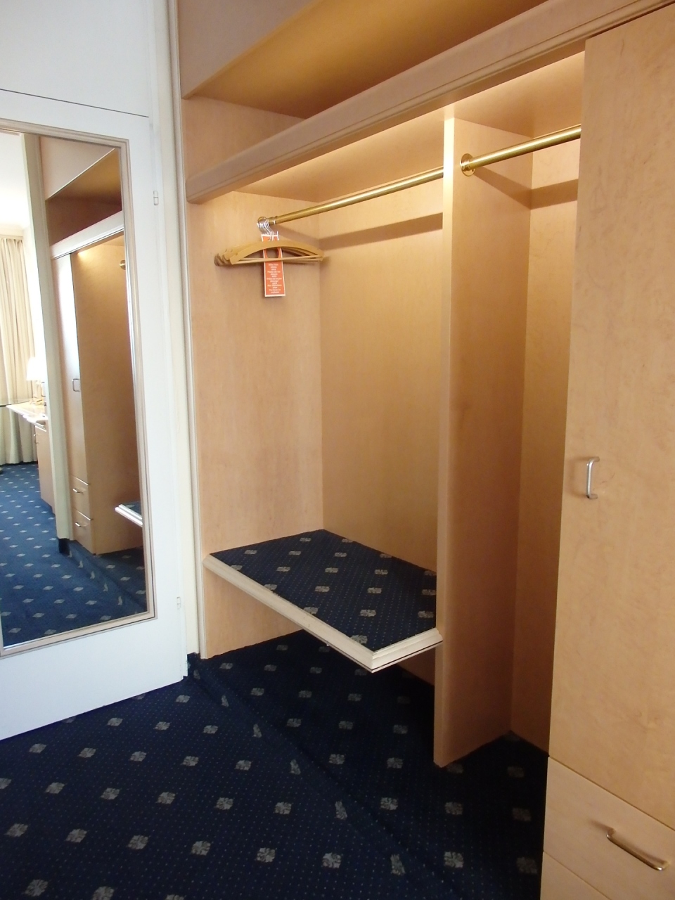 一人旅でシングルルームを予約しましたが、案内された部屋は広々としたダブルルームでした。シャワーのみのバスルームには、ドライヤーや洗面台はなく、クローゼットの隣に洗面台が設置されていました。