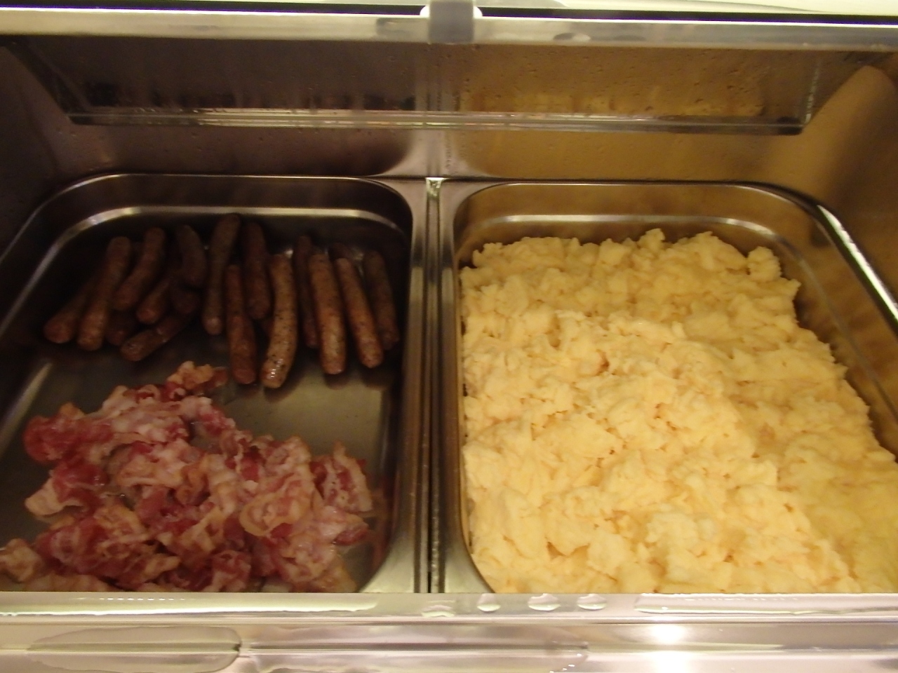 無料の朝食は6:30~10:00、温かいメニューは、焼きソーセージ、スクランブルエッグ、ゆで卵、冷たいメニューは多種類のハム&チーズ、チーズを詰めたマッシュルームやパプリカに生野菜のスライス、ヨーグルト、シリアル類、丸ごとフルーツ、ジュースなど。ホットドリンクはマシーンで10種類ほどから選べます。- 旅行時期