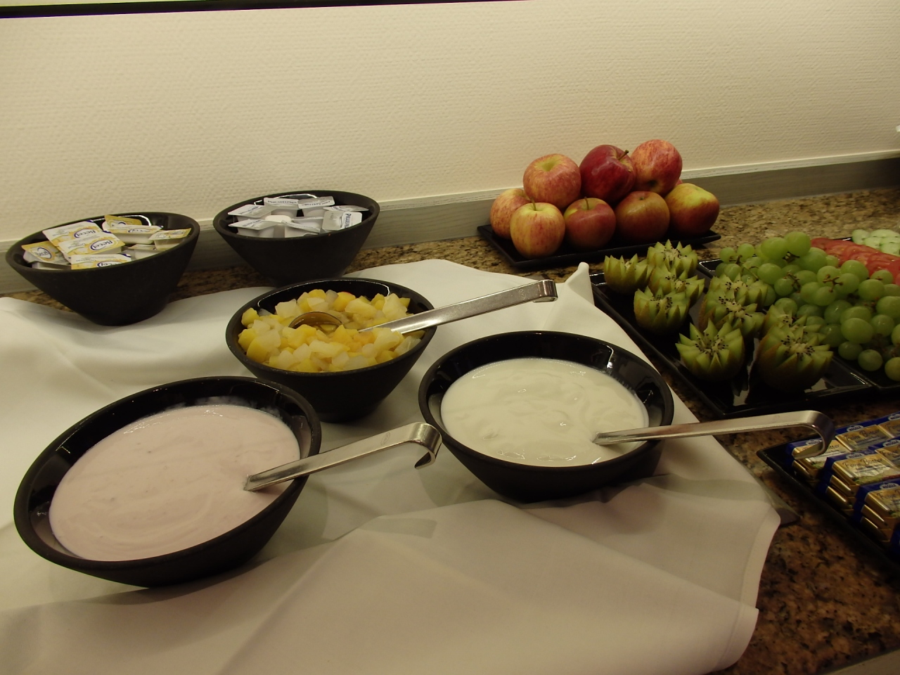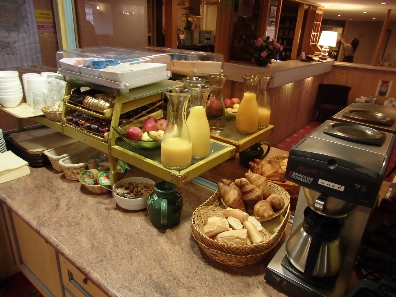 朝食は7:00~10:00、内容は数種類のハム&チーズ、数種のパンとクロワッサン、シリアル類、ヨーグルト、フルーツ、ゆで卵、ドリンク類などです。