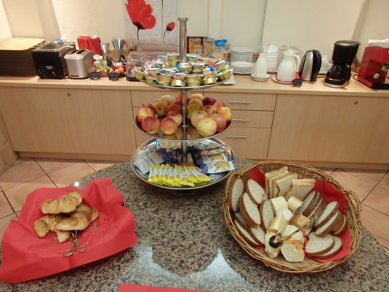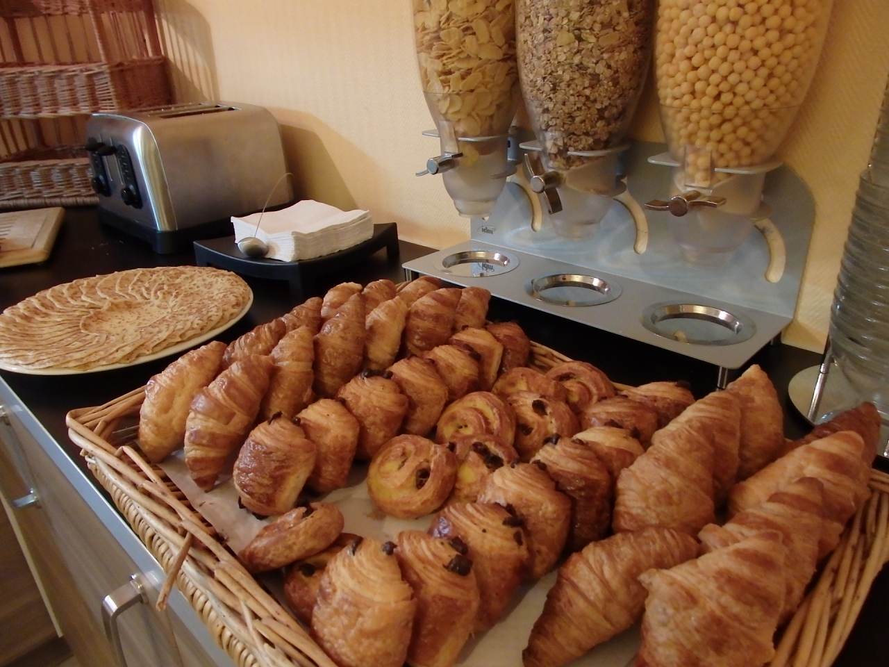 朝食は7時からで、パンやクロワッサン、ハム&チーズ、ヨーグルト、フルーツ、シリアル類、ケーキ、ゆで卵といった内容。2泊したのですが、到着日は早朝だったので、朝食を薦めて下さり、3回の朝食をいただくことになったのですが、追加料金はありませんでした。