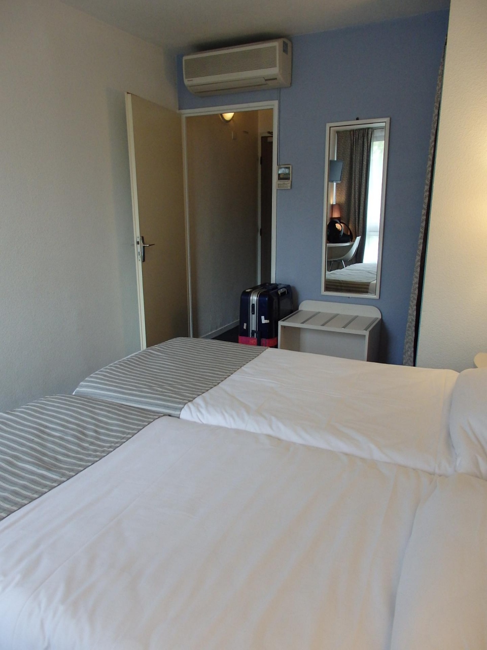 グルノーブル駅から徒歩5分もかからない立地で、中心地へも徒歩圏内。軽い布団がかかるツインベッドのお部屋に泊まりました。