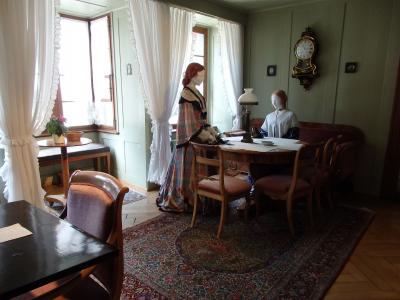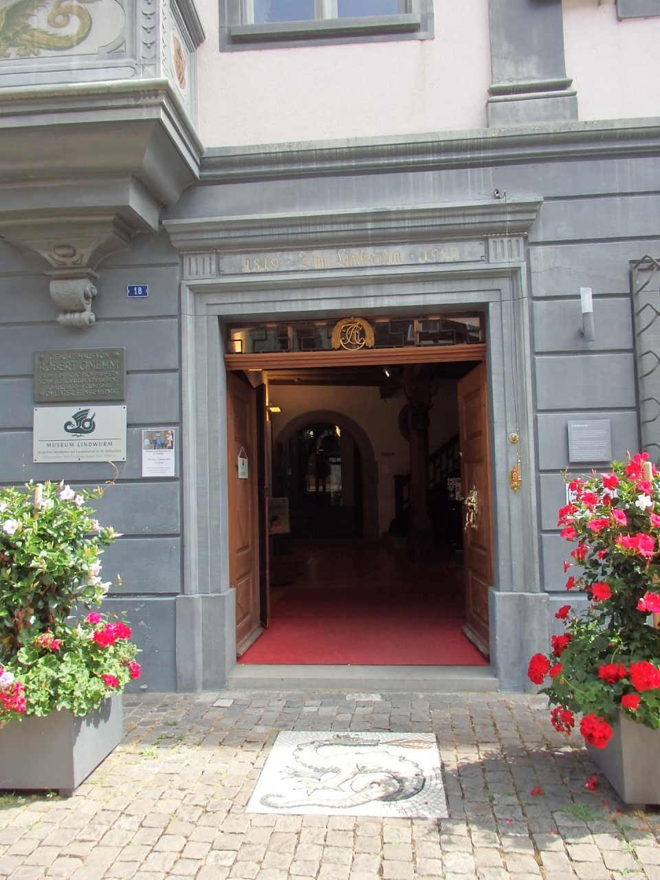 リントヴルム博物館はシュタイン・アム・ラインの中心地である市庁舎広場から西へ延びるウンターシュタット通りをウンター門へ向かう途中の右側にあります。うっかり通り過ぎてしまいそうなほど白壁に水色の木枠が落ち着いた雰囲気の木組み家屋。その歴史は13世紀にまでさかのぼります。館内には19世紀の中産階級の暮らしを再現してあり、小さな中庭を取り囲むように展示室が並びます。入館料は5CHFですが、スイスパスで無料入館できます。